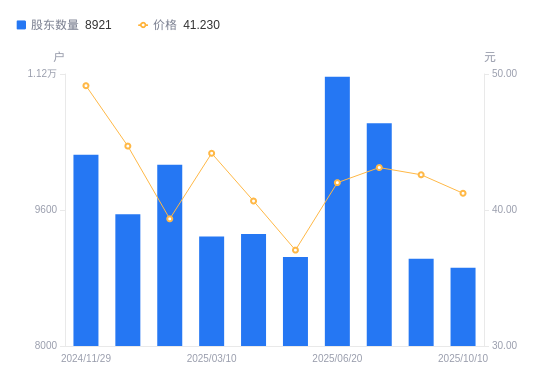 日期A股户数(户)流通A股户均持股数(股)户均持股市值(万元)2025-10-1089212380.889.822025-09-3090272352.9210.022025-06-30106211999.808.622025-06-20111681901.857.992025-05-3090472347.728.702025-03-3193182279.449.272025-03-1092882286.8110.102025-01-27101322096.318.252024-12-3195501884.808.432024-11-29102501756.108.63