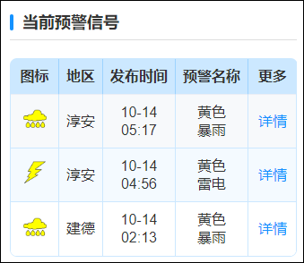此外,淳安发布了暴雨黄色和雷电黄色预警,建德发布了暴雨黄色预警。