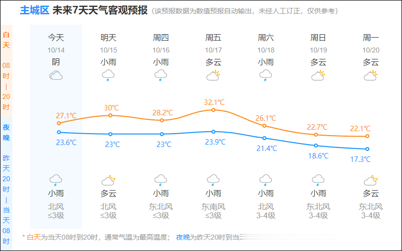 杭州市气象台6时发布的市区天气预报:今天阴到多云,有时有阵雨;明天多云,午后部分阴有阵雨或雷雨;后天多云到阴有时有阵雨。今天偏北风3-4级。今天白天最高气温26℃,明天白天最高气温29℃,明天早晨最低气温22℃,今天平均相对湿度75%。