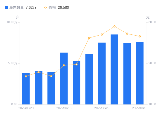 日期A股户数(户)流通A股户均持股数(股)户均持股市值(万元)2025-10-10762433778.4810.042025-09-19749023846.1210.482025-09-10851723382.369.812025-08-29752513828.2910.352025-08-08610794716.5512.362025-07-31530405431.4210.732025-07-18630894566.298.922025-07-10394887295.4412.312025-06-30406357089.5112.682025-06-20385587477.2112.59