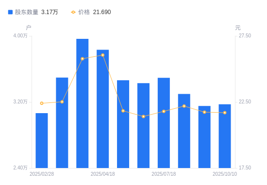 日期A股户数(户)流通A股户均持股数(股)户均持股市值(万元)2025-10-10317266029.0113.082025-09-30315096070.5313.192025-08-29329735801.0012.872025-07-18349205477.5611.942025-06-30342775580.3111.942025-05-30346385522.1512.052025-04-18383304990.2513.002025-04-10396424825.0912.442025-03-31349635470.8212.322025-02-28306485361.0312.01