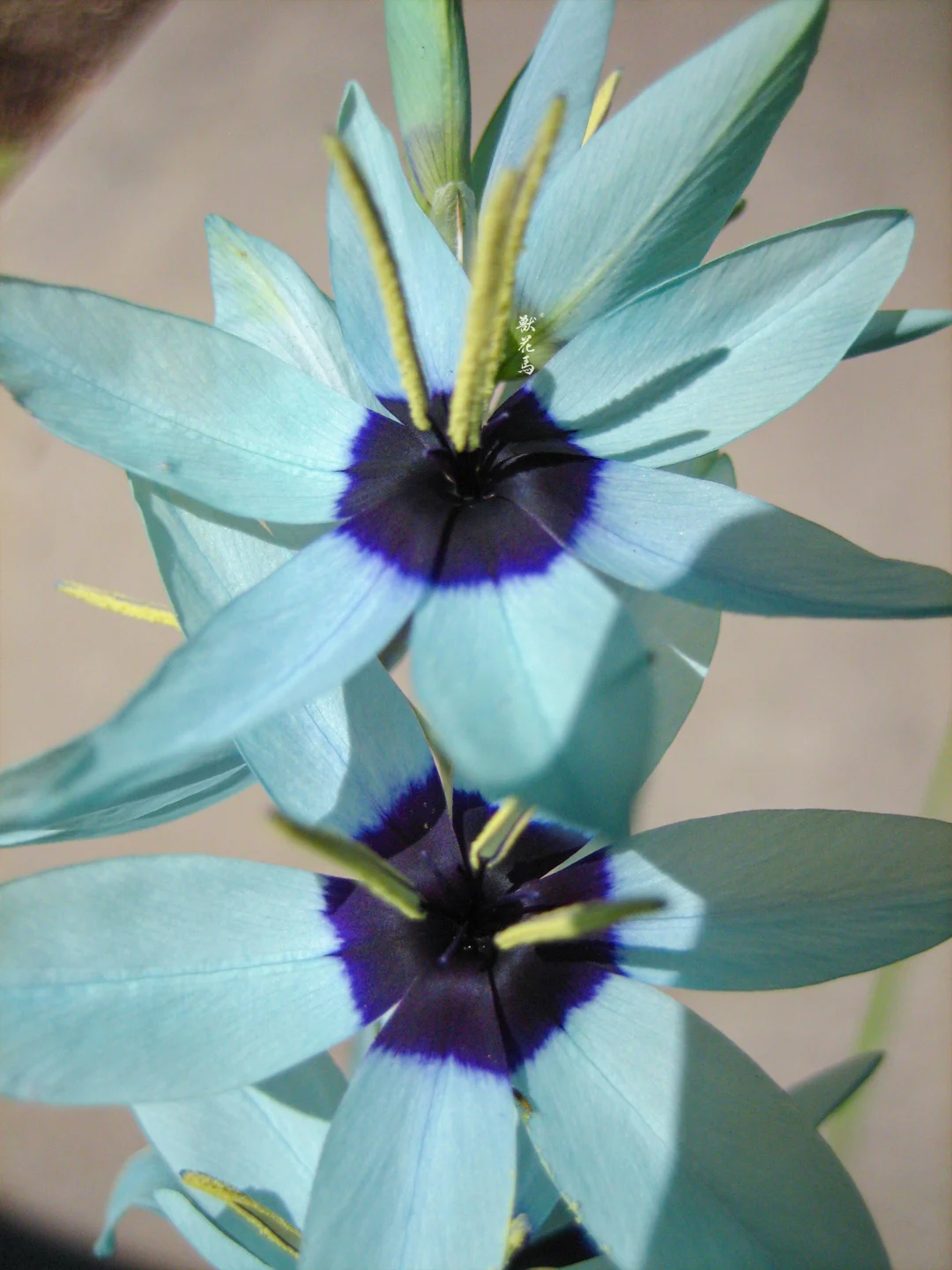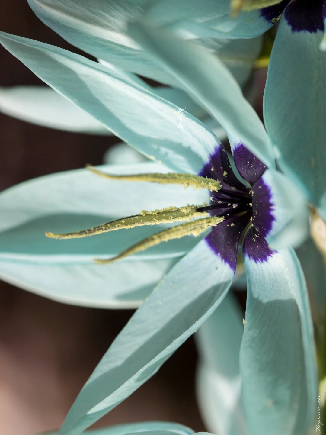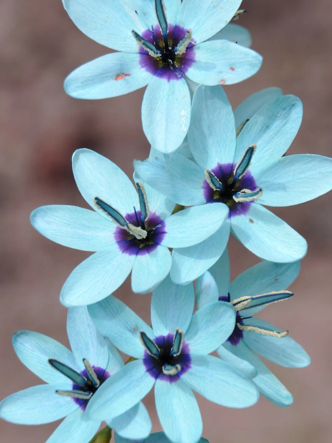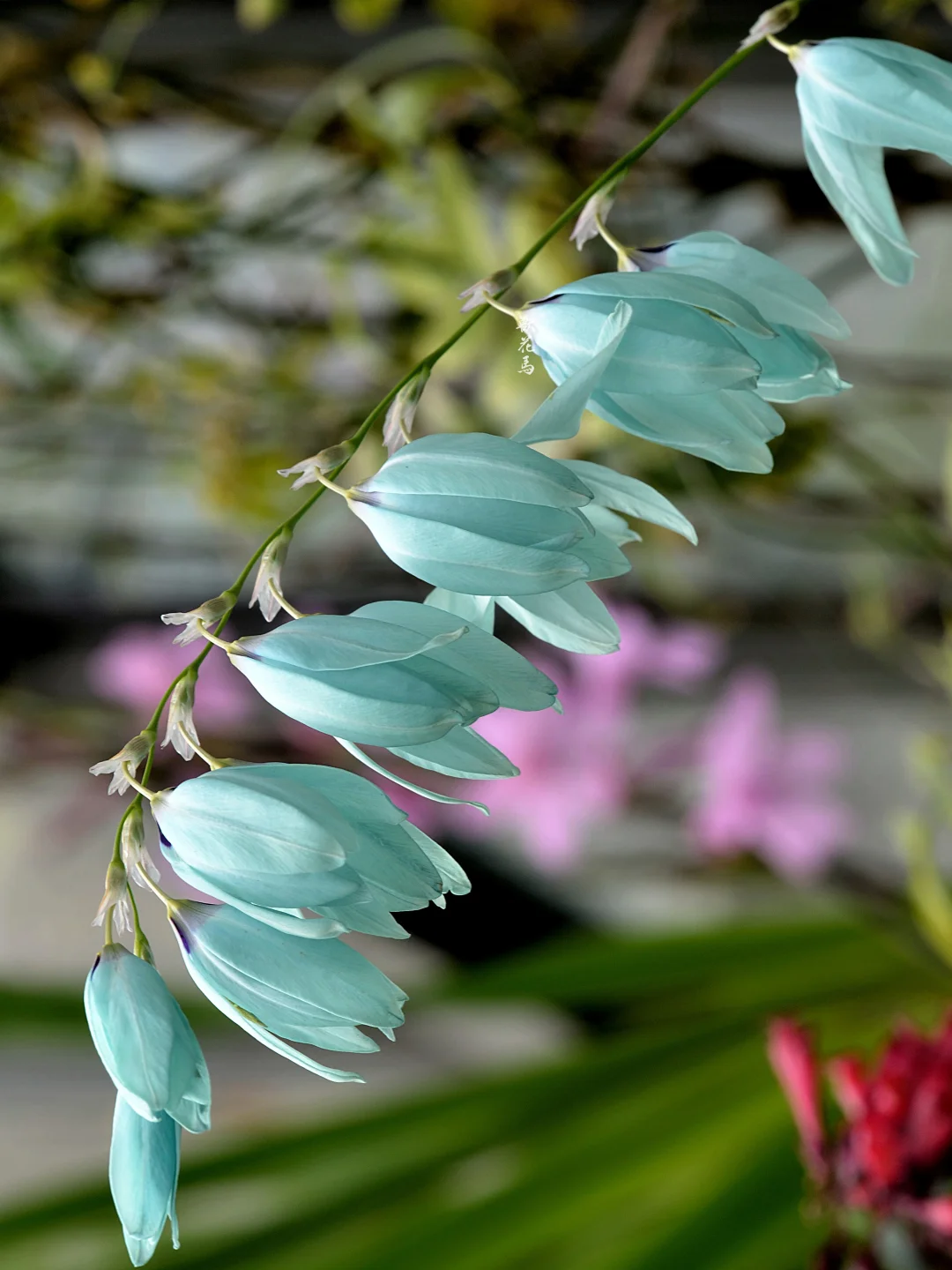 ✨花瓣呈通透的绿松石色,花心带深紫斑纹,如星空坠落