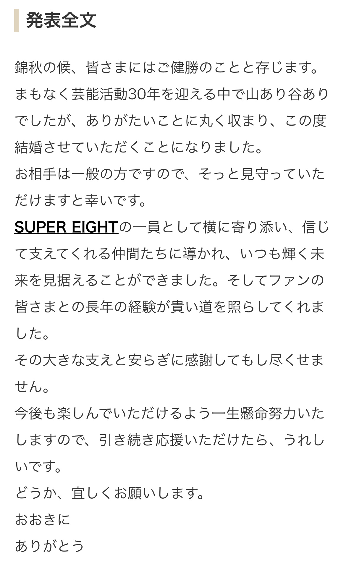 他是继今年2月宣布结婚的大仓忠义之后,第二位已婚成员。