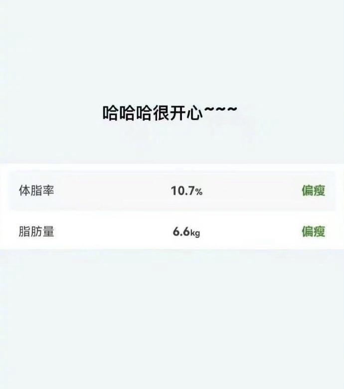 虎扑10月14日讯吴艳妮更新社媒晒图:体脂率10.7%,脂肪量6.6kg,并配文:哈哈哈很开心~~~