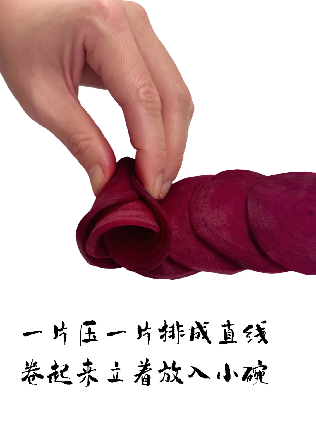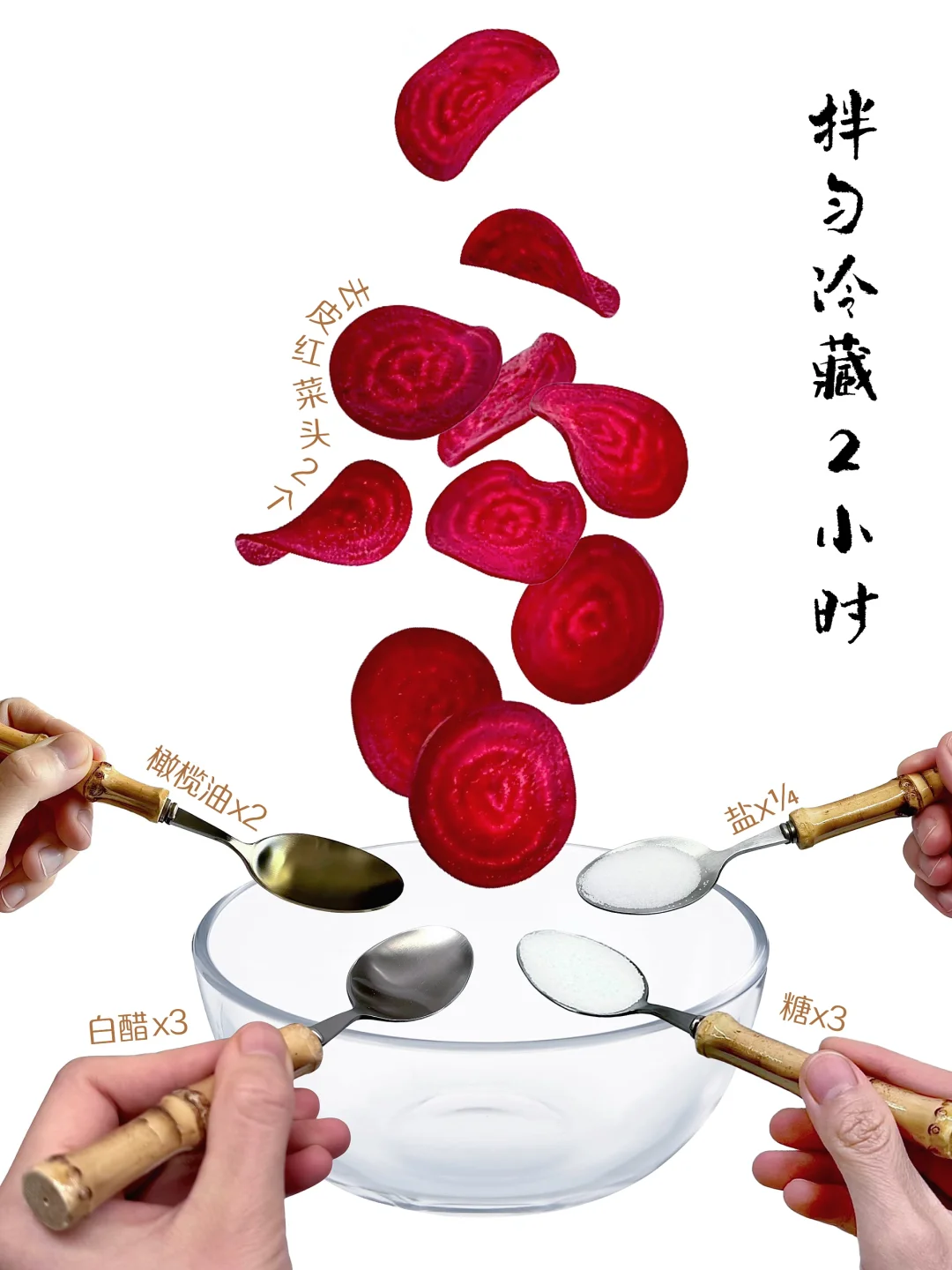 酸酸甜甜的小菜 中西餐食都能轻松hold住 饭前开胃🥗饭中爽口🍛饭后解腻🍽️ 无聊时当小零嘴也OK~ 有红菜头天然养分加持 抗炎!护肝!抗氧化!全部轻松拿捏[okR] 这不妥妥的熬夜躯圣品吗[皱眉R] 🚫食疗不等于医疗 还是早点洗洗睡吧 ⚠️红菜头草酸含量中等偏高 生食注意适量食用 👉Tips 调料比例🉑根据红菜头大小和个人口味灵活调整 做造型🉐戴手套 否则手染色短时间内洗不掉 红菜头片切厚了不易卷🉑先放盐腌出汁沥掉再拌 🥄注释 勺子尺寸均为汤匙