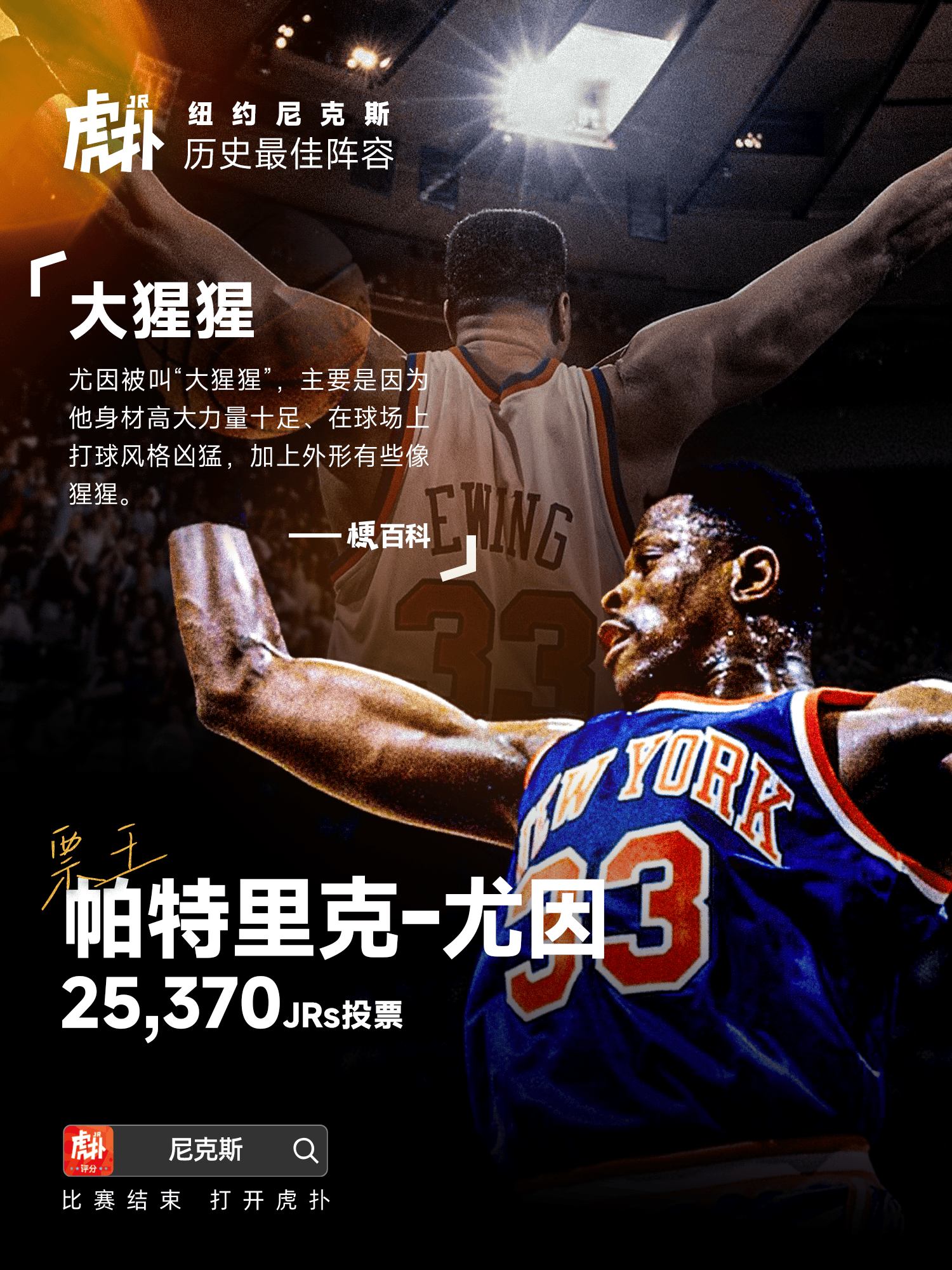 本期评选的球队是——纽约尼克斯队,经过评选,JRs选出的尼克斯队史最佳阵容已正式出炉,其中帕特里克-尤因以25370票当选队史票王!