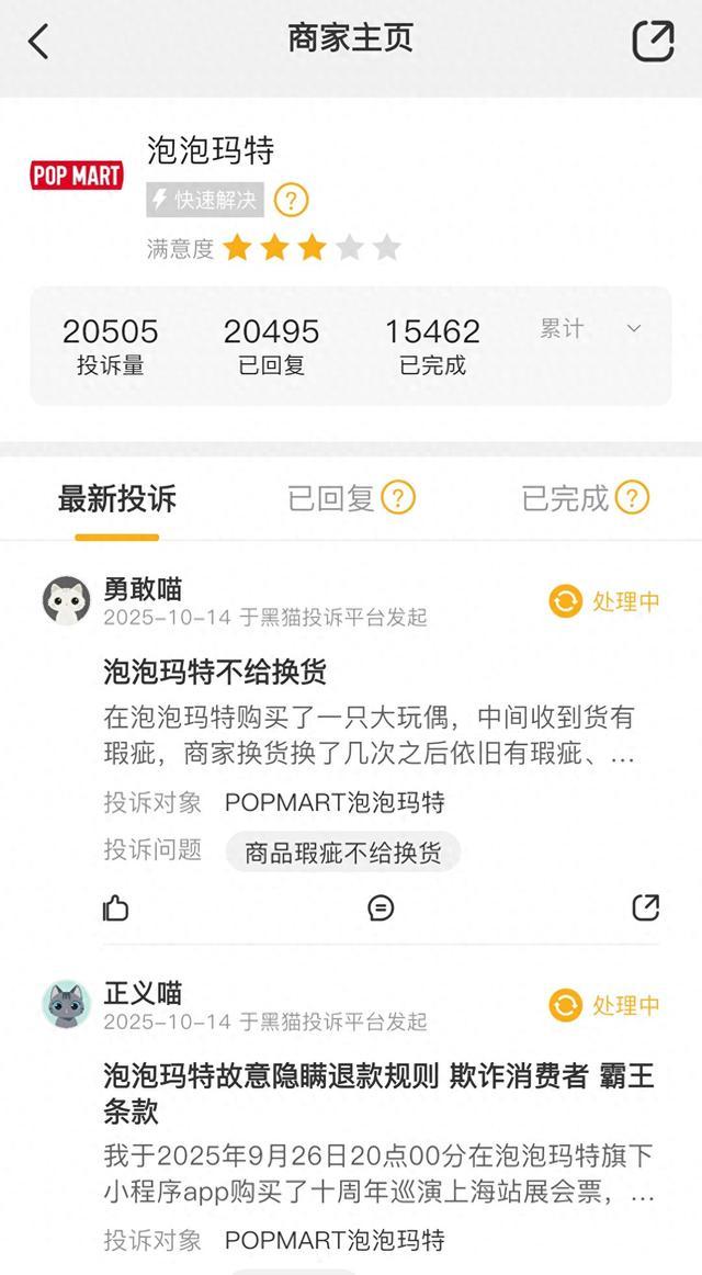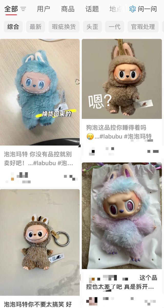 截至报道发出,泡泡玛特在黑猫投诉平台上有20505条投诉信息,其中,关于商品瑕疵的投诉达到3582条,在社媒平台中也不少消费者表示,原价购买的第三代LABUBU出现明显歪头、鼻头掉漆、手部长度不一等情况;部分消费者甚至在申请换货后仍收到存在修复痕迹或瑕疵的商品,称历经四次换货仍未解决问题。
