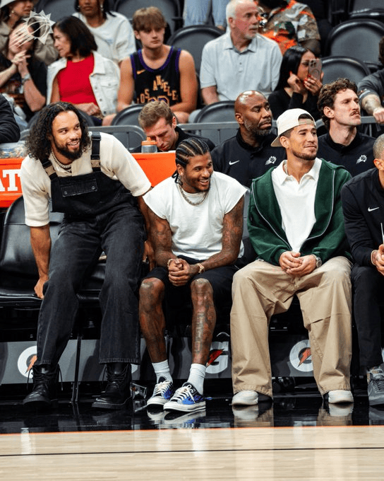 太阳官方晒出狄龙、杰伦-格林和布克场边的照片与球迷分享,并附文:“场边支持!”