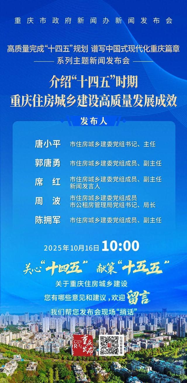 10月16日10:00,重庆市政府新闻办将举行“高质量完成‘十四五’规划谱写中国式现代化重庆篇章”系列主题新闻发布会,介绍“十四五”时期重庆住房城乡建设高质量发展成效。
