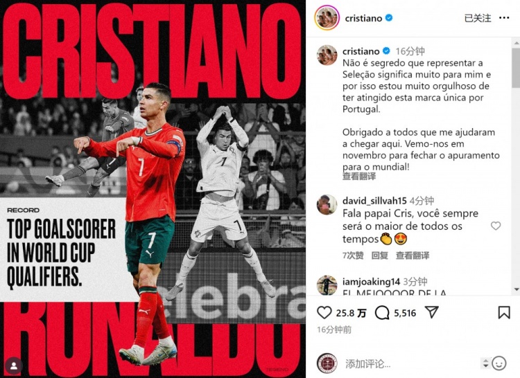 C罗社媒晒出海报庆祝,配文:“众所周知,代表国家队出战对我来说意义重大,因此能为葡萄牙达成这一独特里程碑,我深感自豪。”