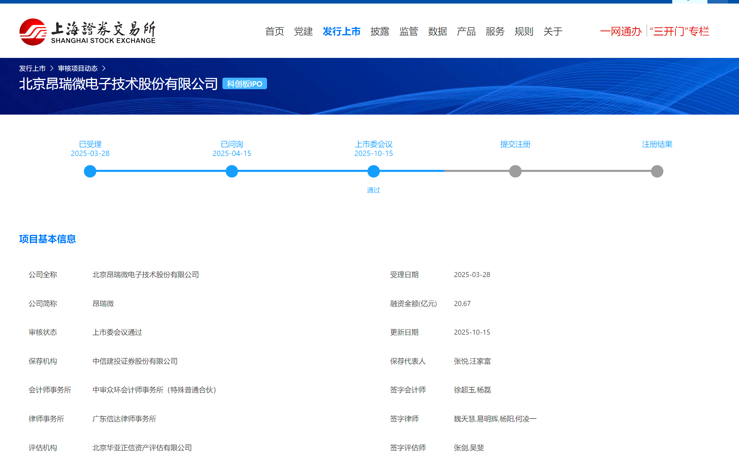 上证报中国证券网讯10月15日晚,上海证券交易所网站更新北京昂瑞微电子技术股份有限公司(简称“昂瑞微”)审核状态为“上市委会议通过”。昂瑞微科创板IPO过会。