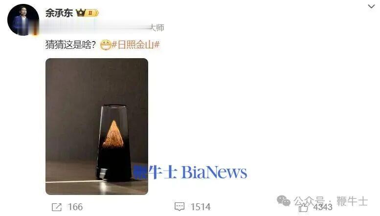 10月15日,华为常务董事、终端BG董事长余承东发布微文,晒出一款华为新品,带有“日照金山”话题,并表示“猜猜这是啥?”