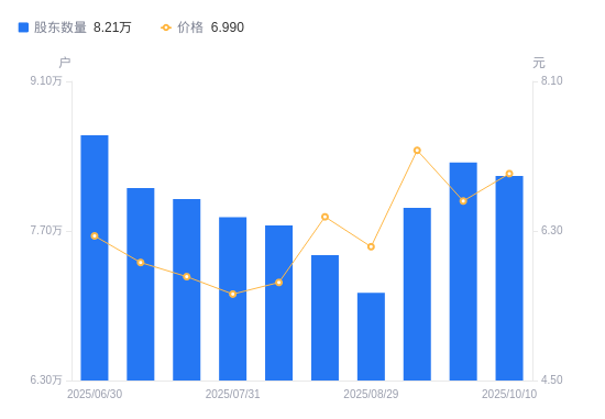日期A股户数(户)流通A股户均持股数(股)户均持股市值(万元)2025-10-10821456744.594.712025-09-30834076642.544.422025-09-10791746997.685.092025-08-29712027781.164.752025-08-20747257414.314.802025-08-08775207146.984.062025-07-31782857077.143.922025-07-18799916926.213.982025-07-10810096839.174.052025-06-30859546445.714.02