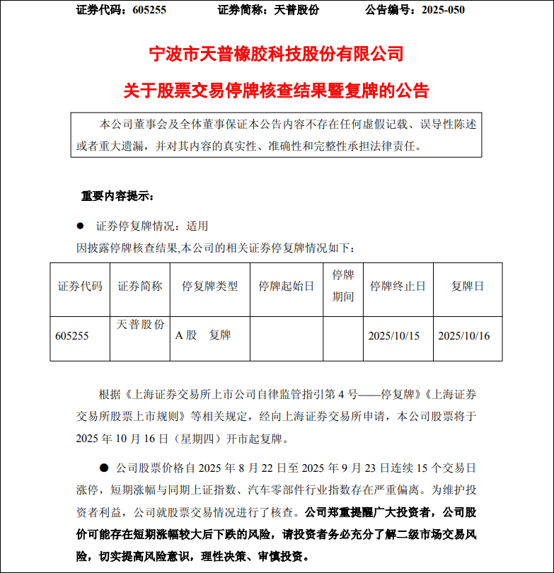 15连板大牛股天普股份复牌“一字”跌停,原因是这个