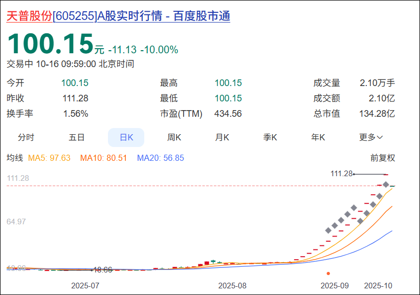 今日,浙江15连板“大牛股”天普股份第三次复牌交易。开盘虽然还是“一字板”,不过这次是向下的一字板,出现跌停,最新价报100.15元/股。