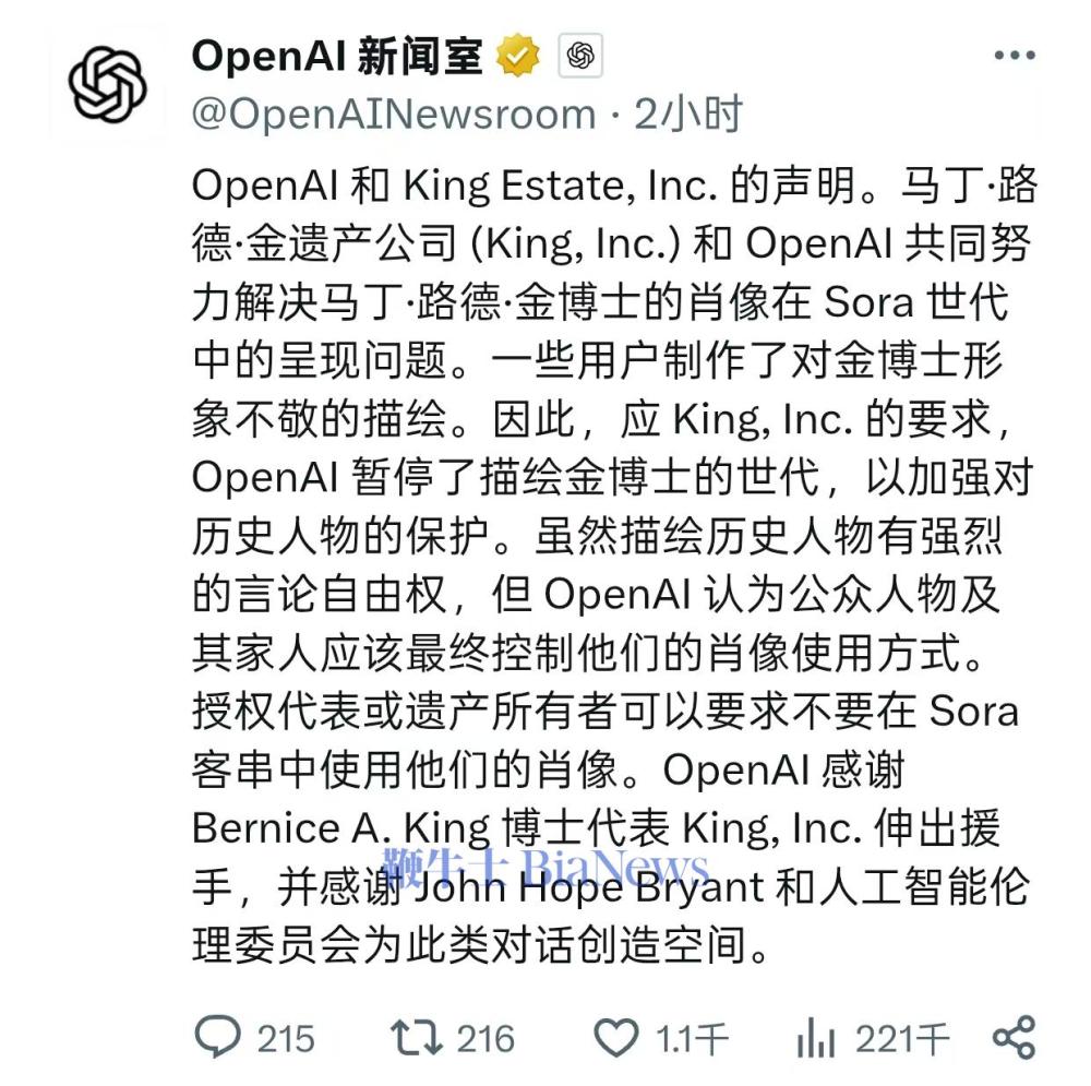 OpenAI在官方声明中表示,尽管描绘历史人物涉及言论自由,但公众人物及其家属应拥有最终控制权,授权代表或遗产所有人可要求Sora停止使用其肖像进行“客串”。同时,OpenAI正加强对历史人物的保护措施。