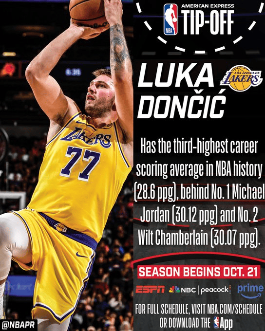 卢卡·东契奇以场均28.6分的生涯得分位列NBA历史第三,仅次于排名第一的迈克尔-乔丹(场均30.12分)和排名第二的威尔特-张伯伦(场均30.07分)。