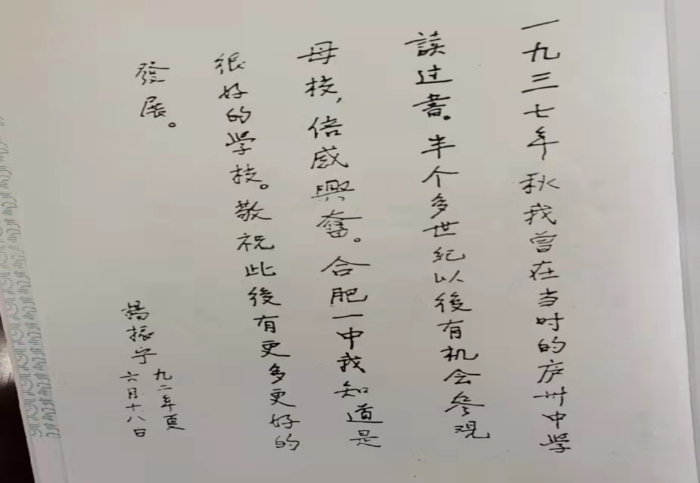 2022年12月3日,合肥一中举办120周年校庆时,杨振宁先生由于身体原因未能出席,为了弥补这份遗憾,他专门录制了视频祝福母校。在祝福视频中,杨振宁说:“1937年的夏天,日本人发起了卢沟桥事变,我们一家就回到了合肥。所以那年的秋天,我来到合肥一中读书,虽然时间很短,但对合肥一中有很深的印象。我的记忆里头是觉得学校很努力的在办,老师、同学态度都非常好,给我留下非常好的值得怀念的记忆。”