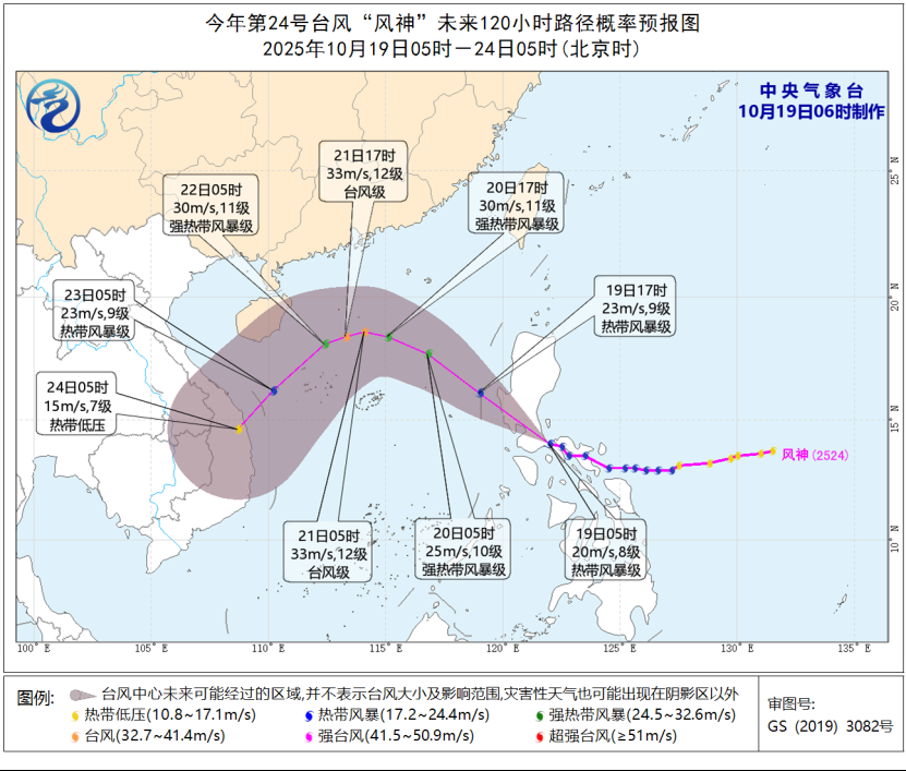 中央气象台10月19日6时发布台风蓝色预警:今年第24号台风“风神”(热带风暴级)昨天傍晚在菲律宾吕宋岛东南沿海登陆(18米/秒,998百帕),今天(19日)早晨5点钟其中心位于菲律宾吕宋岛上,中心附近最大风力有8级(20米/秒),中心最低气压为995百帕,七级风圈半径150-180公里。