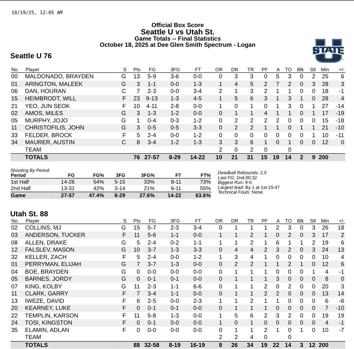 虎扑10月19日讯今日NCAA季前赛,西雅图大学76-88不敌犹他州立大学。