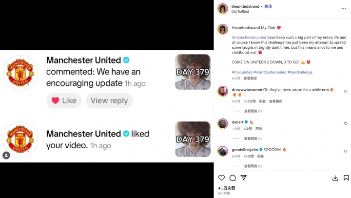 蓄发哥曾立下誓言,如果曼联没有取得5连胜,他就不会剪头发,他每天都会在社媒发布打卡视频,时至今日他已经蓄发380天。