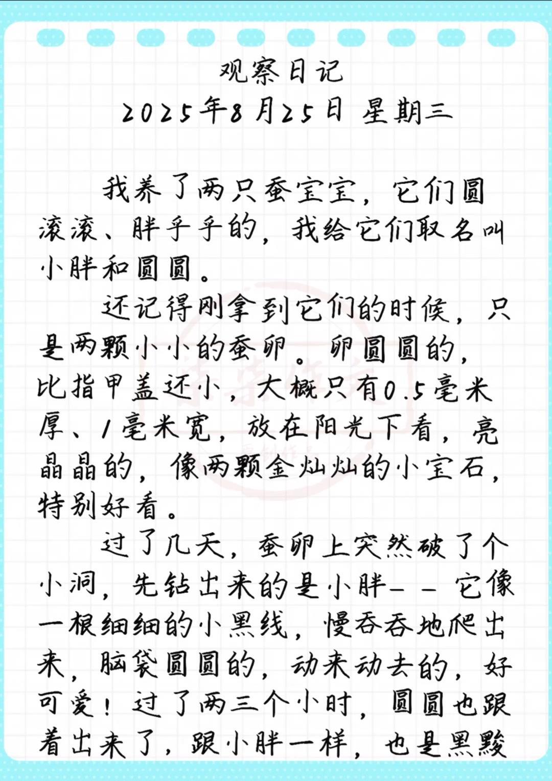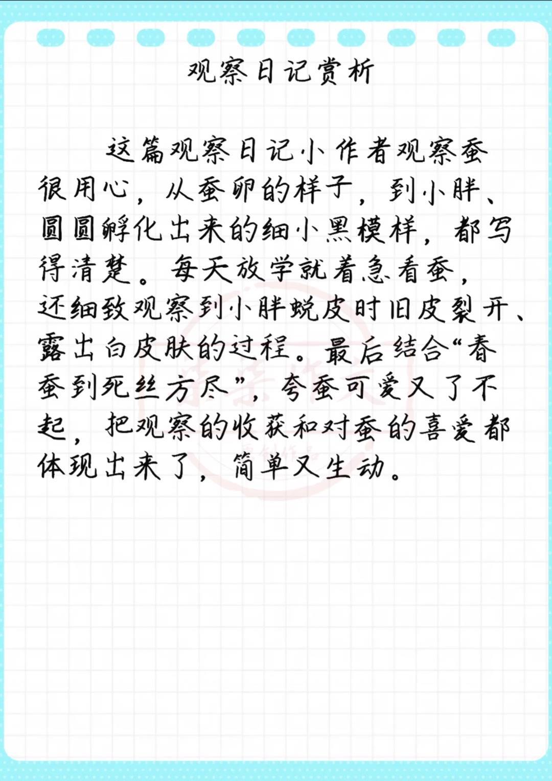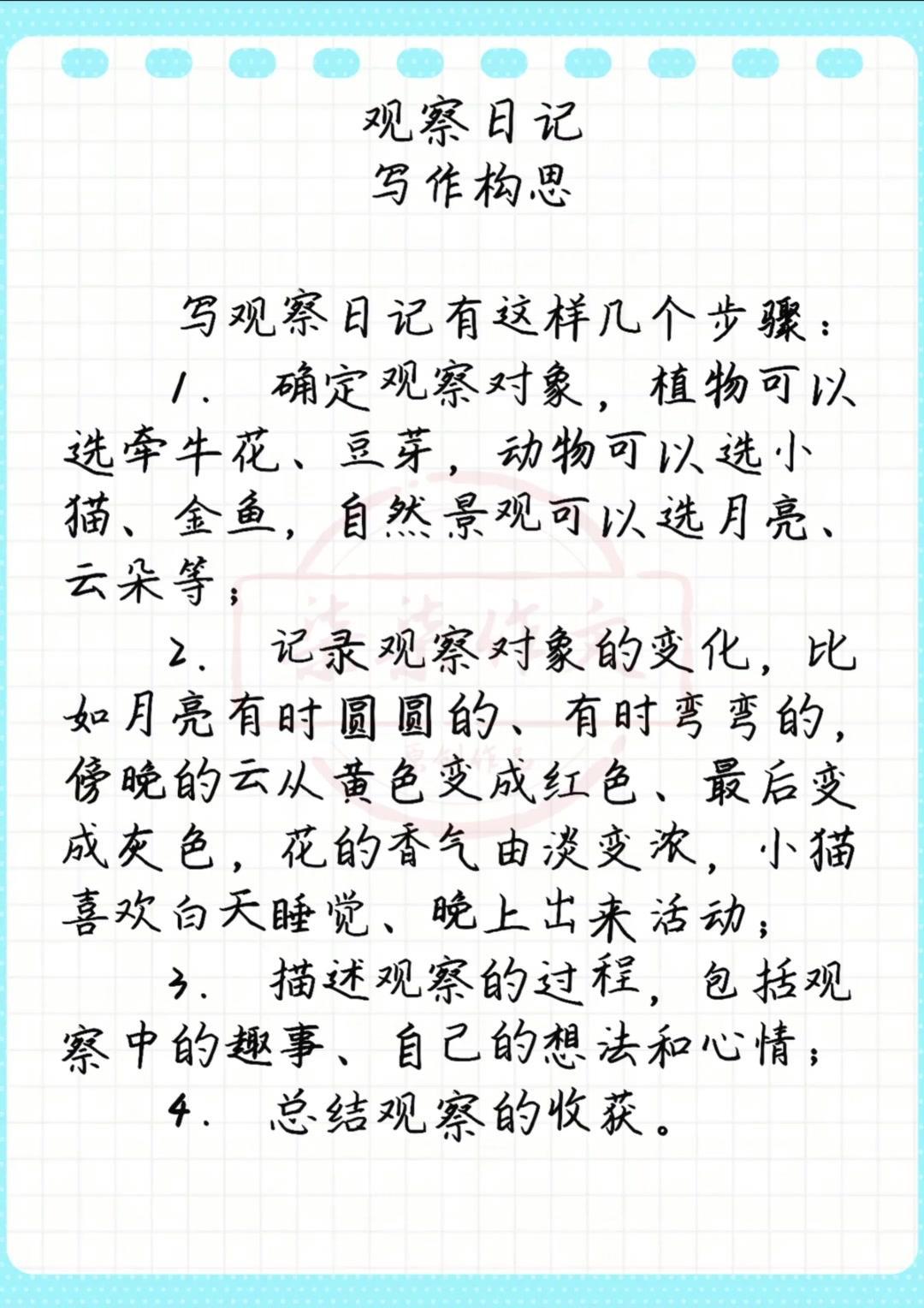 小学生观察日记怎么写?4个万能模板,孩子照着套就能拿高分! 🌱观察日记不用愁,这几个模板超实用!先确定观察对象,比如小动物、植物、日常用品,或者像我一样观察家里的小仓鼠🐹。 1️⃣写动物:从外形到习性。比如观察小仓鼠,先描述它的毛色、眼睛大小,再写它吃东西的样子,爪子怎么捧食物,晚上会不会跑滚轮。我家仓鼠特别喜欢囤瓜子,每次都把食物藏进颊囊里,鼓鼓的像塞了两颗小豆子,超可爱~ 2️⃣写植物:生长变化+细节感受。比如养豆芽,每天记录高度变化,叶子从嫩黄到翠绿,茎从细弱到挺拔。昨天发现豆芽旁边长了小蚂蚁,它们会不会也喜欢这“绿色甜品”?这种小发现让作文更生动~ 3️⃣写日常物品:功能+使用场景。比如我写保温杯,先写它的颜色、形状,再写冬天装热水,第二天早上还是暖暖的,杯身上的卡通图案被我摔过几次也没掉,像个“忠诚的小伙伴”。 4️⃣写事件:按时间顺序记过程。比如观察一次包饺子,从和面、擀皮到包馅,每个人的动作都不一样,妈妈捏的花纹像小元宝,我包的总是“肚子”鼓鼓的。最后煮出来的饺子特别香,这是观察中的小收获~ 观察日记就是把看到的、听到的、想到的记录下来,像写日记一样自然,再加点自己的小想法,就能写出好作文啦!