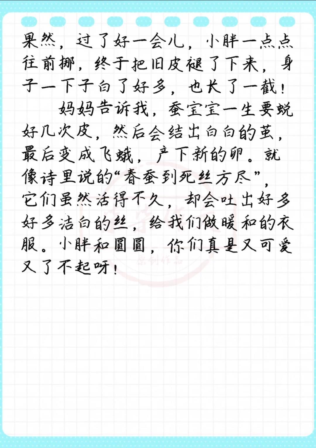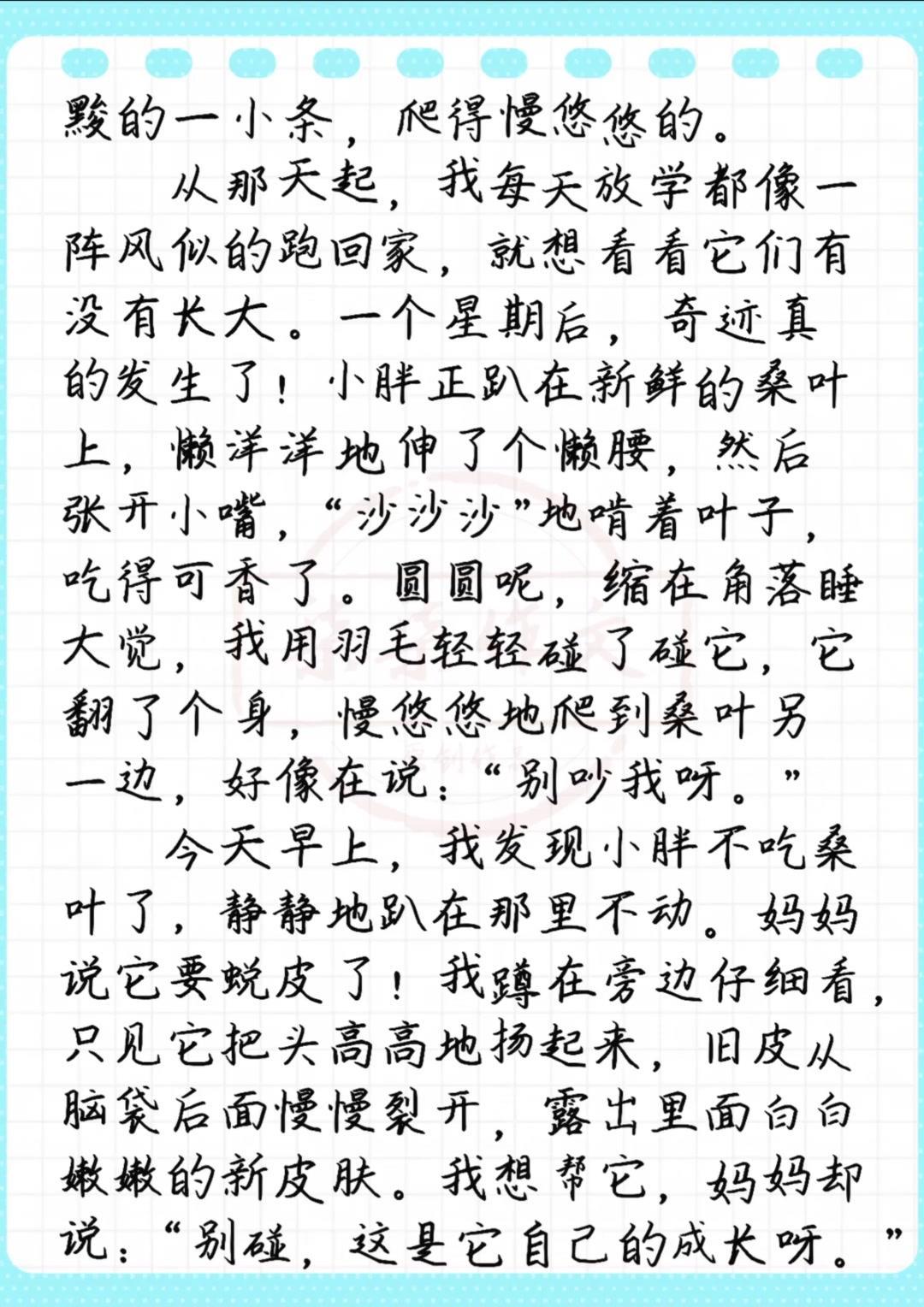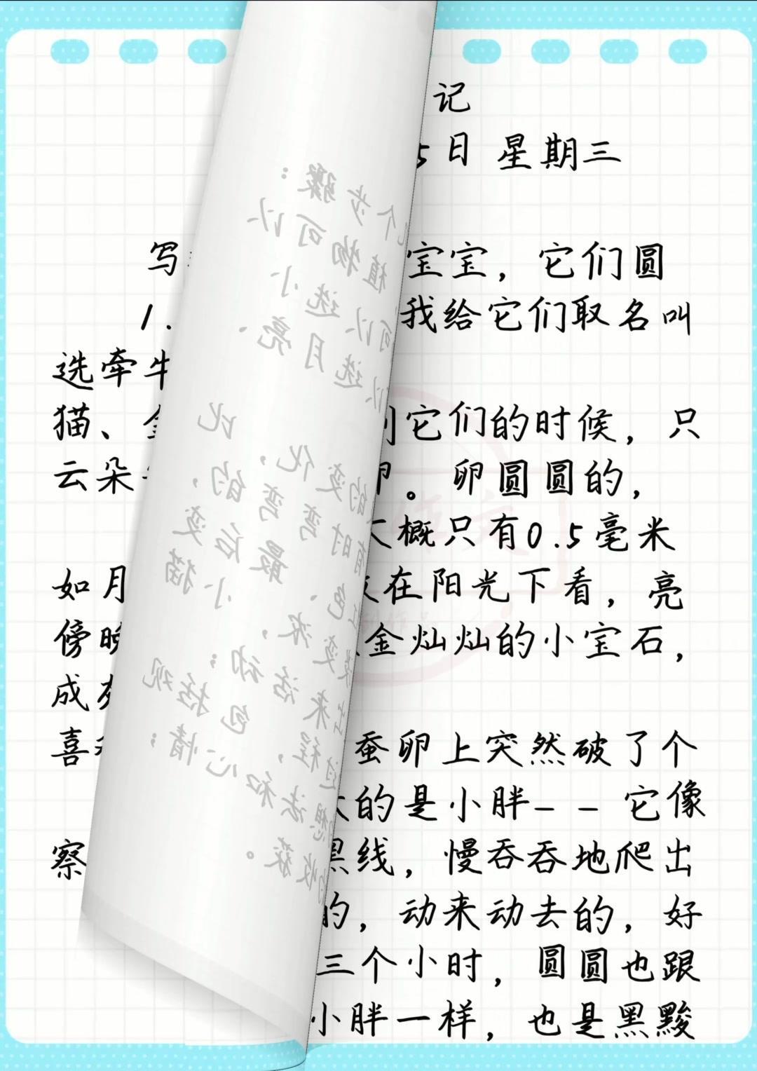 小学生观察日记怎么写?4个万能模板,孩子照着套就能拿高分! 🌱观察日记不用愁,这几个模板超实用!先确定观察对象,比如小动物、植物、日常用品,或者像我一样观察家里的小仓鼠🐹。 1️⃣写动物:从外形到习性。比如观察小仓鼠,先描述它的毛色、眼睛大小,再写它吃东西的样子,爪子怎么捧食物,晚上会不会跑滚轮。我家仓鼠特别喜欢囤瓜子,每次都把食物藏进颊囊里,鼓鼓的像塞了两颗小豆子,超可爱~ 2️⃣写植物:生长变化+细节感受。比如养豆芽,每天记录高度变化,叶子从嫩黄到翠绿,茎从细弱到挺拔。昨天发现豆芽旁边长了小蚂蚁,它们会不会也喜欢这“绿色甜品”?这种小发现让作文更生动~ 3️⃣写日常物品:功能+使用场景。比如我写保温杯,先写它的颜色、形状,再写冬天装热水,第二天早上还是暖暖的,杯身上的卡通图案被我摔过几次也没掉,像个“忠诚的小伙伴”。 4️⃣写事件:按时间顺序记过程。比如观察一次包饺子,从和面、擀皮到包馅,每个人的动作都不一样,妈妈捏的花纹像小元宝,我包的总是“肚子”鼓鼓的。最后煮出来的饺子特别香,这是观察中的小收获~ 观察日记就是把看到的、听到的、想到的记录下来,像写日记一样自然,再加点自己的小想法,就能写出好作文啦!