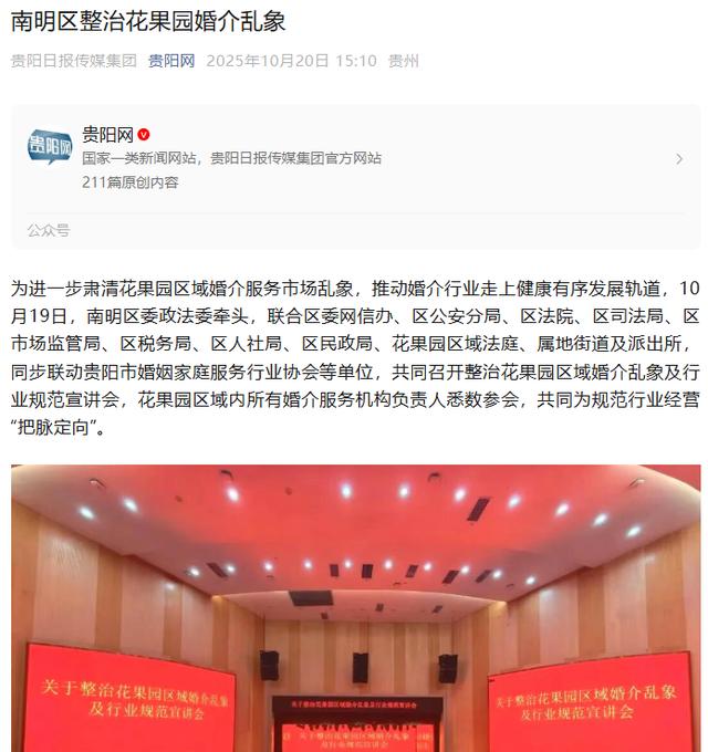 大皖新闻记者注意到,10月20日下午,贵阳日报传媒体团官方账号还发布了一篇名为《南明区整治花果园婚介乱象》的文章。再早前,贵阳市公安局南明分局官方账号也发布了一篇名为《婚前这三件事缺一不可》的文章,文中详细披露了婚骗常用“套路”,其中便有通过“闪婚+双骗”套取钱财的行为。