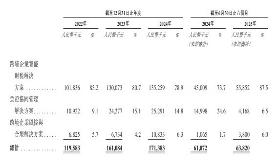 其中,擎天全税通的跨境企业智能财税解决方案主要涵盖敏捷云及单证管理系统等产品。于2022年、2023年及2024年以及截至2025年6月30日止六个月,我们的跨境企业智能财税解决方案产生的收入分别为人民币101.8百万元、人民币130.1百万元、人民币135.3百万元及人民币55.9百万元,分别占同期总收入的85.2%、80.7%、78.9%及87.5%。