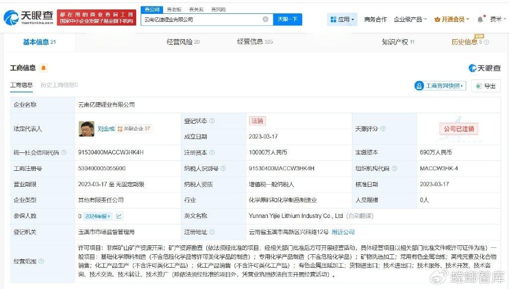 天眼查App显示,近日,云南亿捷锂业有限公司登记状态由存续变更为注销。此前,该公司已发布简易注销公告。