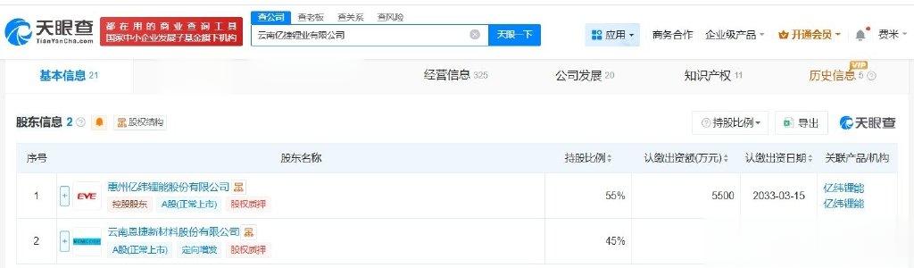 云南亿捷锂业有限公司成立于2023年3月,法定代表人为刘金成,注册资本1亿人民币,经营范围包括非煤矿山矿产资源开采、矿产资源勘查、基础化学原料制造等。股东信息显示,该公司由亿纬锂能(300014)、恩捷股份(002812)共同持股。
