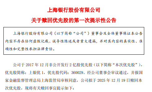 10月21日金融一线消息,上海银行今日发布关于赎回优先股的第一次提示性公告。公告显示,公司于2017年12月非公开发行2亿股优先股(以下简称“本次优先股”),优先股简称:上银优1,优先股代码:360029。经公司董事会审议通过,并报国家金融监督管理总局上海监管局审核同意,公司拟于2025年12月19日赎回本次优先股。