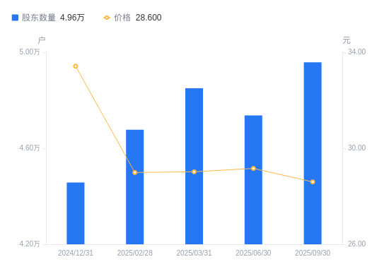 日期A股户数(户)流通A股户均持股数(股)户均持股市值(万元)2025-09-304958411159.7831.922025-06-304736911681.6234.062025-03-314850011409.2033.112025-02-284676911831.4834.302024-12-314457412414.1141.492024-09-304336812759.3343.062024-06-304473712368.8837.092024-03-314892111311.0235.462024-02-294622611970.4635.732023-12-315025011011.8729.69