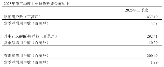 数据显示,2025年第三季度,中国电信移动用户总数达到4.3719亿户,第三季度净增用户数448万户;5g网络用户数达2.9241亿户,本季度净增1039万户;有线宽带累计用户数达2.0049亿户,本季度净增189万户。