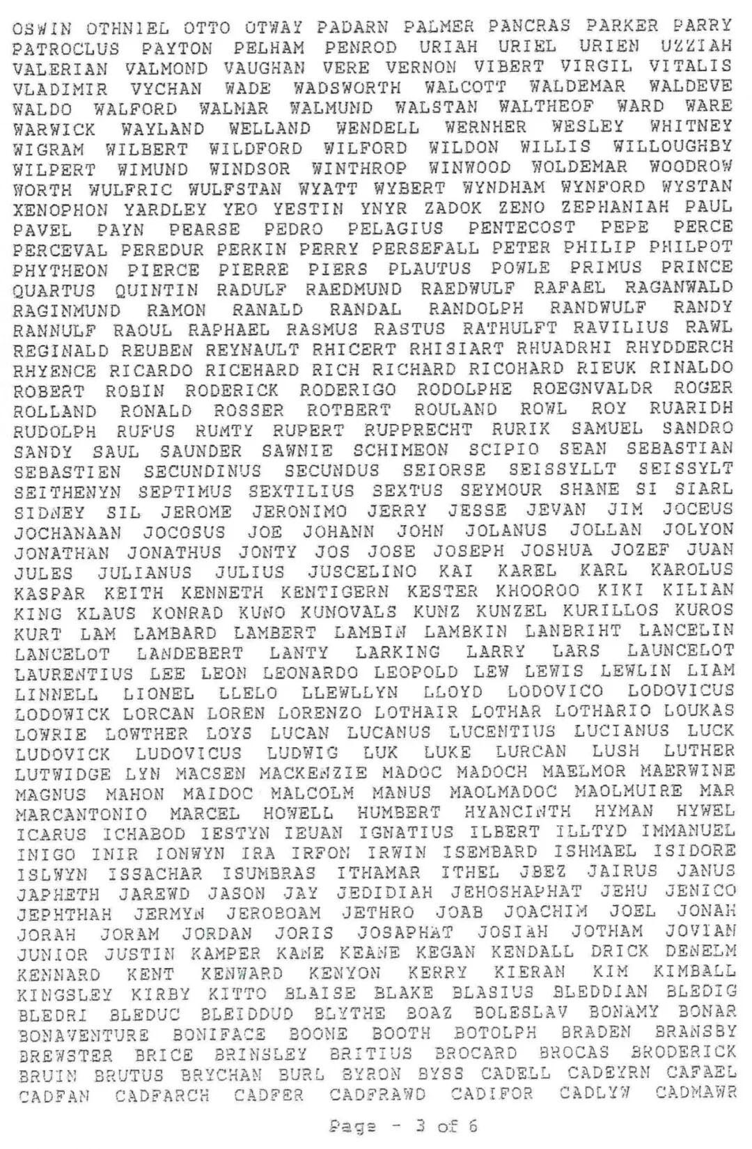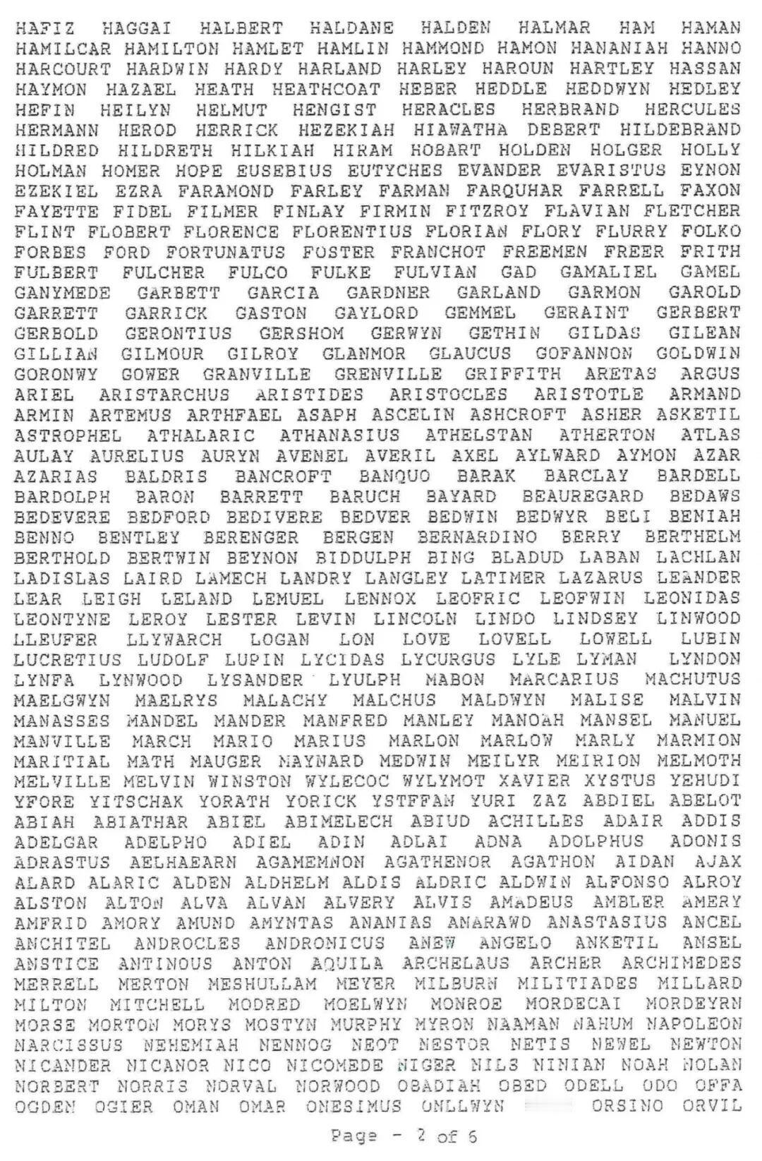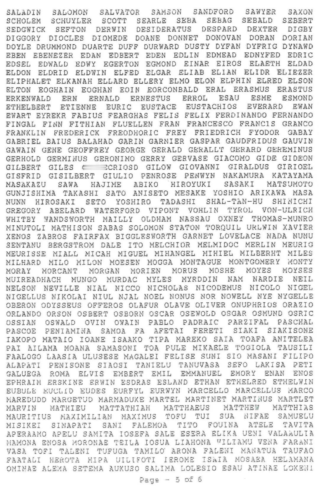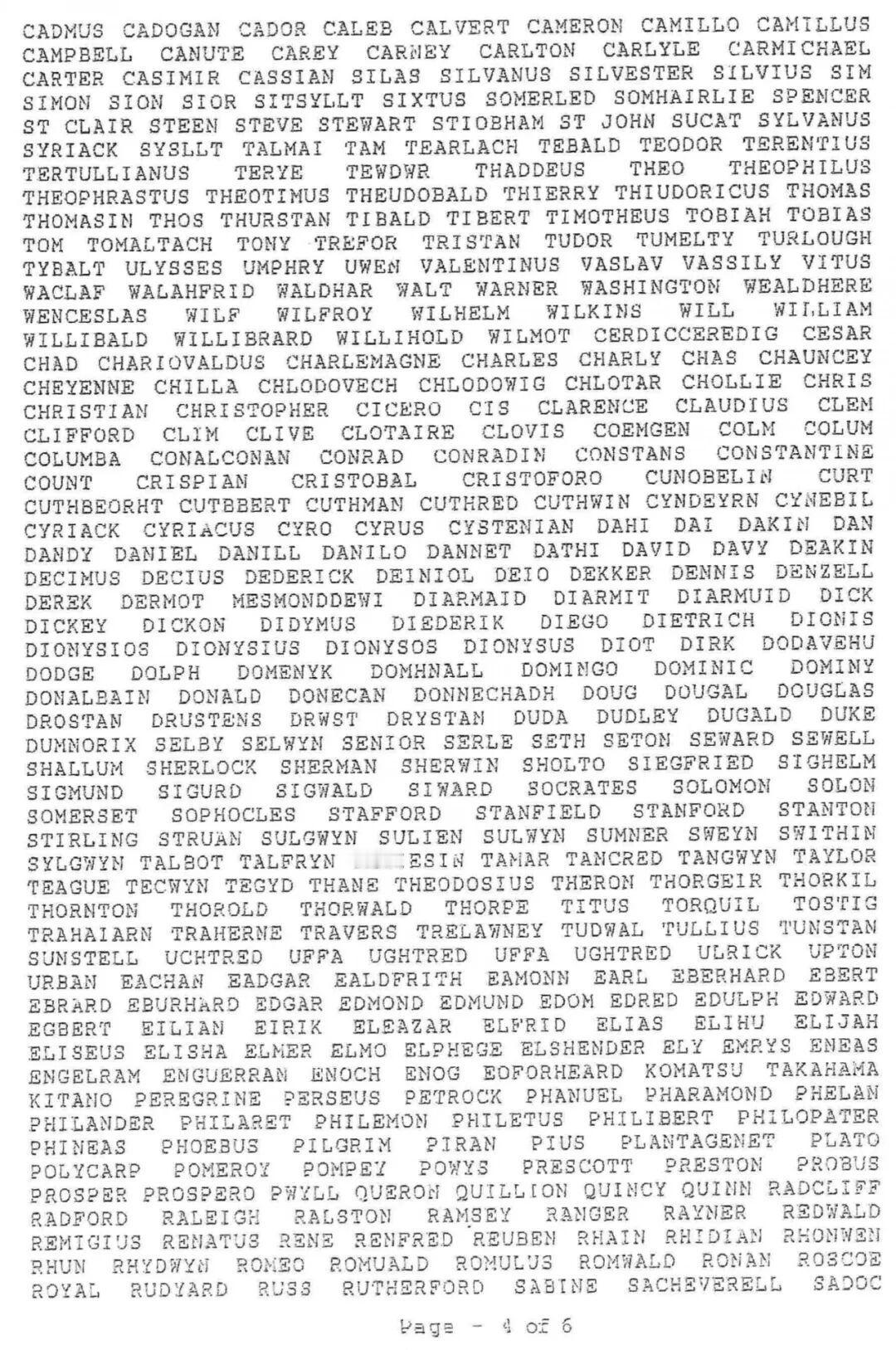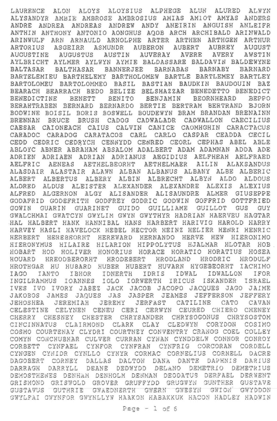 新西兰60岁退休保安劳伦斯·沃特金斯(Laurence Watkins)以2253个字符的个人姓名创下世界纪录。1990年,他在原有姓名劳伦斯·格雷戈里·沃特金斯(Laurence Gregory Watkins)基础上新增2250个中间名,该纪录近日获吉尼斯世界纪录重新认证。 沃特金斯在接受CNN采访时表示,他从小就对《信不信由你!》(Ripley's Believe It or Not!)这一电视节目着迷不已,一直梦想着能拥有一个属于自己的世界纪录。“那些纪录保持者总是令我惊叹不已——无论是跑得最快的选手、身材最高的巨人、力量最强的壮士,还是拥有最长秀发或指甲的奇人。” 然而,身为一个自认为“毫无特长”的普通人,沃特金斯自觉并无其他过人之处,便决定挑战最长姓名这一纪录。为此,他花费了一个月的时间构思新名字,灵感来源于拉丁语、古英语人名、历史名人,以及在奥克兰图书馆工作时参考的《婴儿取名指南》和毛利语词典。 这项改名申请1990年遭新西兰登记官驳回,但沃特金斯通过高等法院上诉胜诉。他解释:"当时法律并未禁止此类命名,因此我赢得了官司。"该案促使新西兰修订《姓名登记法》,现规定公民姓名不得包含官职头衔、等级称号、侮辱性词汇、数字符号,或超过70个字符(含空格)。 据报道,沃特金斯将姓名简化为劳伦斯·阿隆·阿洛伊·沃特金斯(Laurence Alon Aloy Watkins),签名则采用"沃特金斯五世"(Watkins V)的贵族式写法。不过其完整姓名在出生证明上占据七页篇幅,原护照需额外增补六页才能完整呈现。 他的完整名字如下,共六页纸。