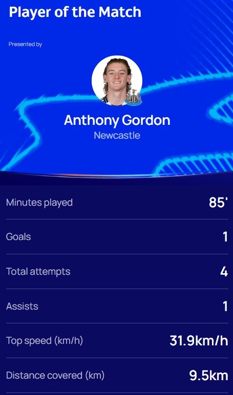 传射建功!欧冠官方:戈登当选纽卡3-0本菲卡全场最佳