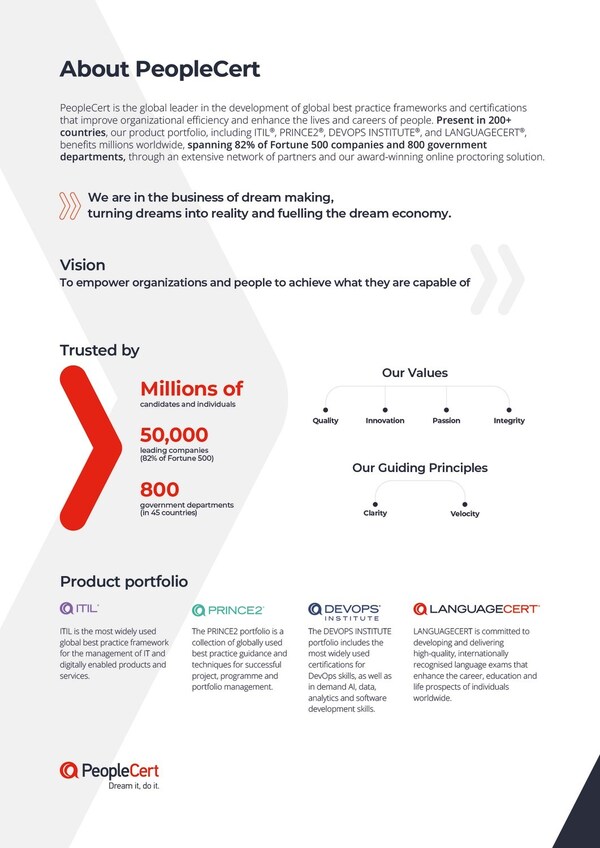 PeopleCert旗下IT服务管理框架ITIL®、项目管理最佳实践PRINCE2®、DevOpsInstitute以及语言认证品牌朗思国际测评(LanguageCert)
