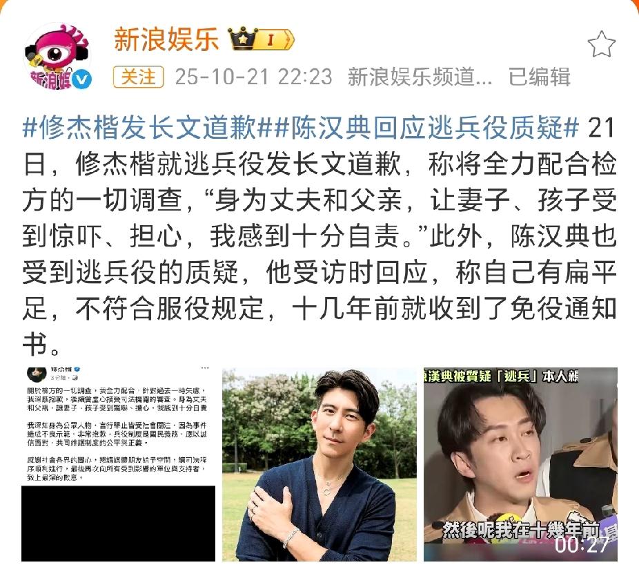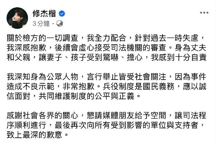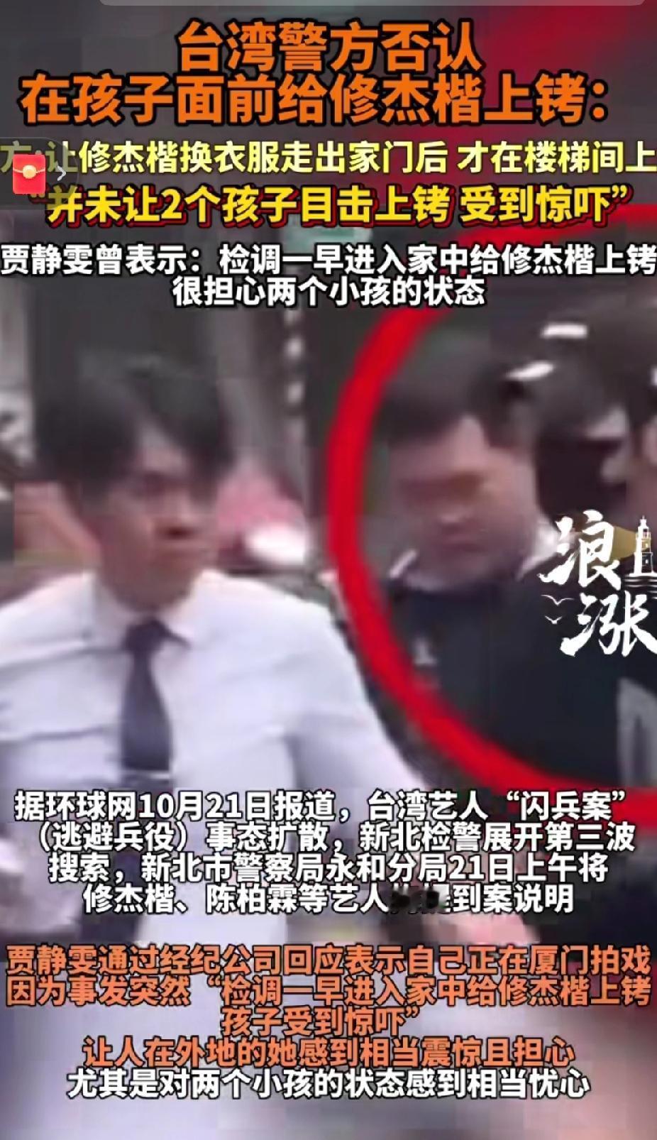 贾静雯老公修杰楷发长文,看似道歉,可细品下来又像是在呐喊。 他的长文内容说:“身为父亲,让妻子、孩子受到惊吓、担心,感到十分自责。” 因为昨天有消息以及新闻视频,修杰楷当时戴着口罩,穿戴整齐捂得很严实。被警方戴上手铐,带走了上了警车,疑似因为逃兵役,这是第三波的审查,就有他一个,涉及“闪兵案”。 结果第二天他就发长文。于是有大批的网友质疑湾湾的警方,那几个帽子叔叔是否应该收敛一点,不应该在孩子面前给父亲戴手铐。 然而湾湾警方已经回应称,只是通知他早带他去调查。在家门外等着他,让修杰楷自己穿戴整齐,戴上口罩,然后出来以后才给他戴上手铐,带上警车的。并没有当着老婆和孩子的面戴手铐。 贾静雯也称孩子受到惊吓。今天陈汉典也接受采访,力挺修杰楷。声称自己因为是扁平足,所以很早就被排除了,不够资格当兵入伍。难道扁平足真的不能当兵入伍?贾静雯老公