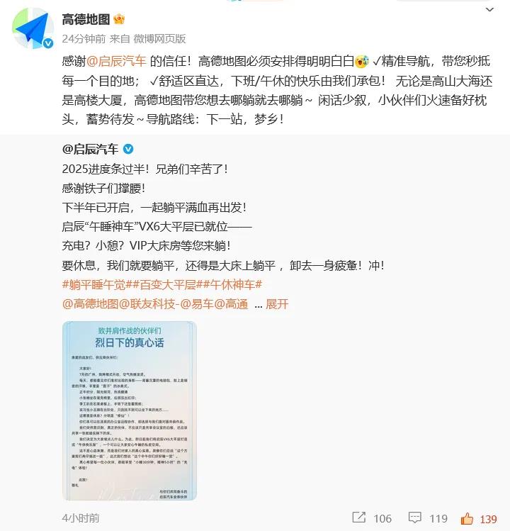成为启辰的合作伙伴真好,午休还能躺床上 在微博发现启辰的感谢信超暖心 启辰主动为所有伙伴提供午休的地方,让疲惫有处安防 这份跨越身份、直抵人心的关怀,足显启辰细节和诚意