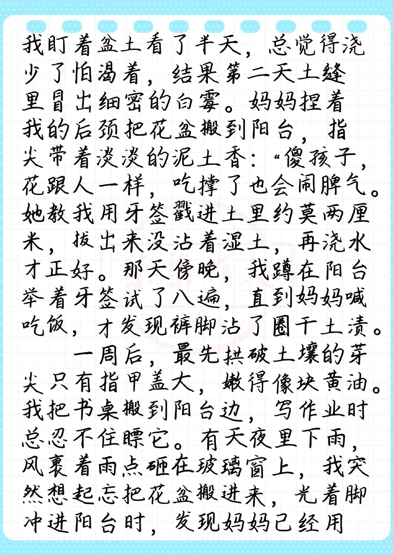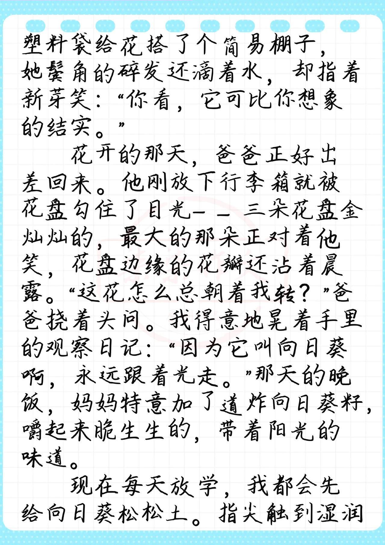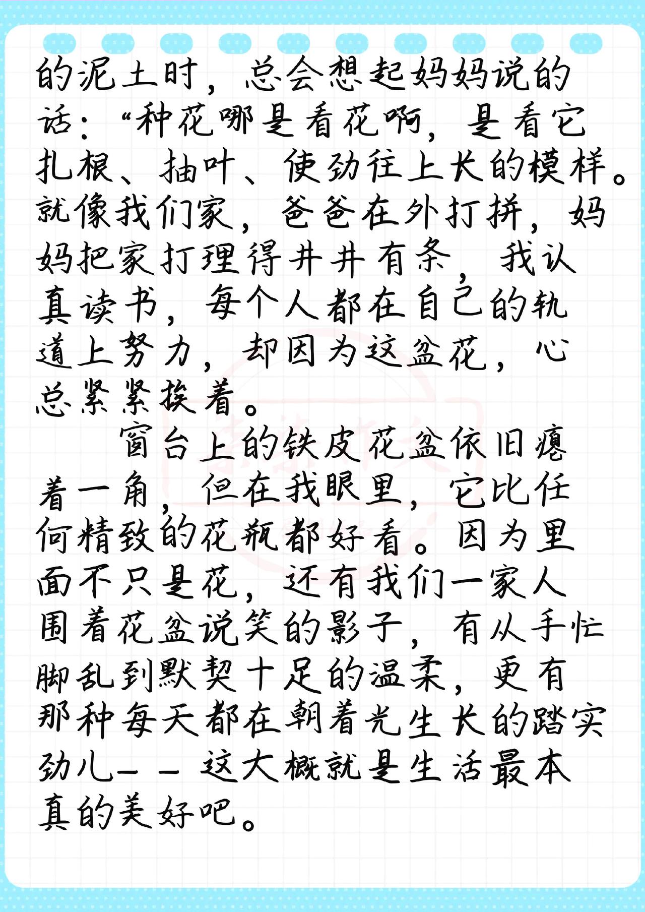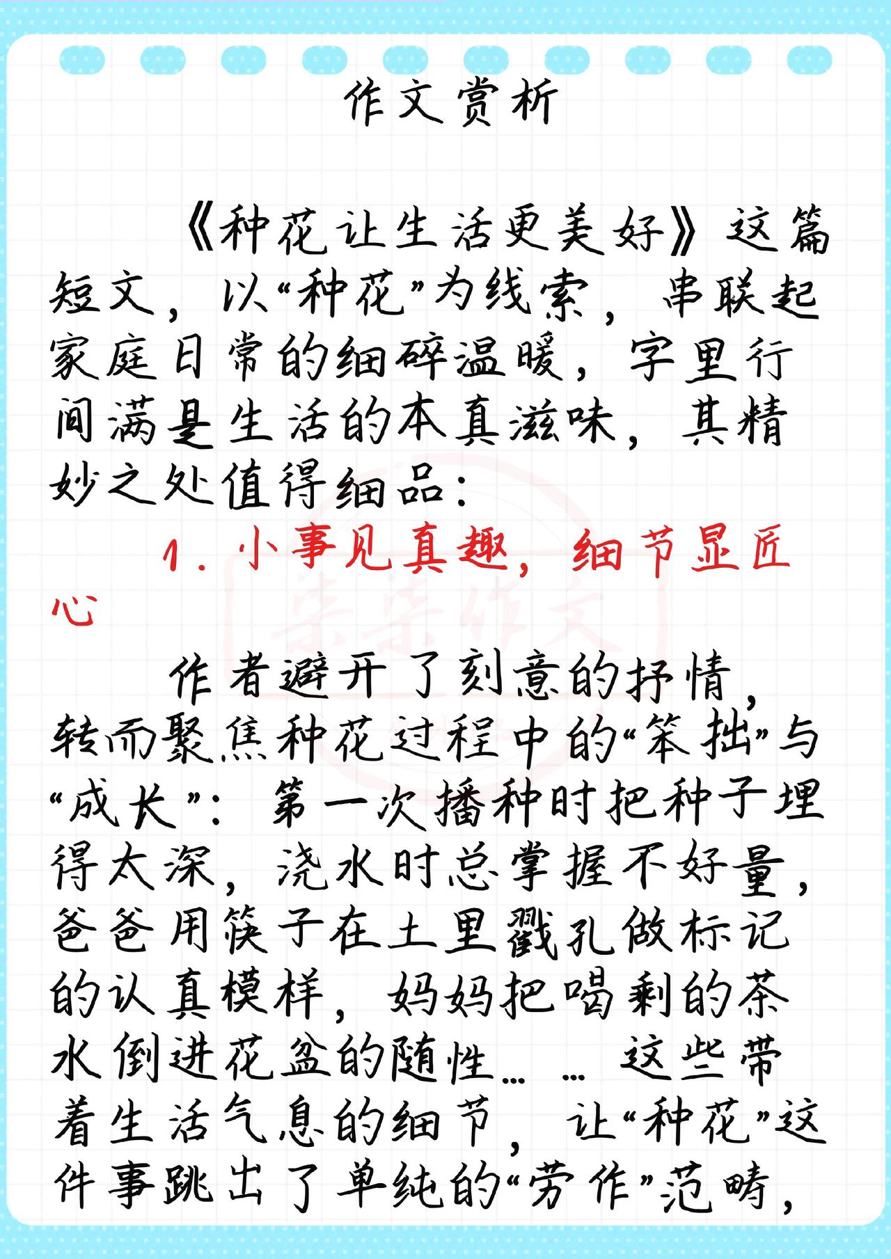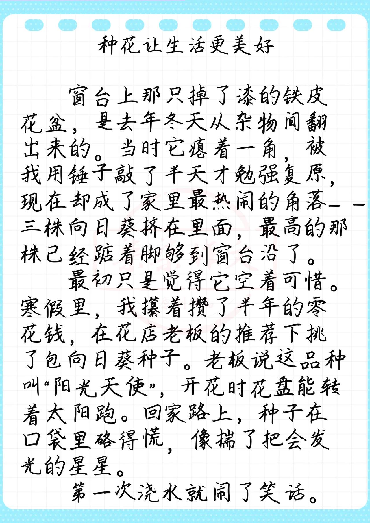 六年级上册第3单元作文优秀范文来啦!老师亲自批改过的高分作文,简单好模仿,照着写基础分稳拿~ 这是一道半命题作文,《写作指导:》,补题时,别总盯着“科技”“自然”这类大词——试着往抽屉深处找找:妈妈揉面团时洒在案板上的面粉,爷爷修自行车时垫在车座下的旧报纸,甚至是每天放学路上必买的那支红豆冰棒。那些带着体温的小物件,才藏着“美好”的密码。 要写清“更”字里藏的变化。比如写“烤红薯让生活更美好”,不能只说“冬天吃着暖”,得先讲从前:放学回家冷得缩脖子,楼道里黑黢黢的,钥匙总插不准锁孔。再写现在:拐角处的烤红薯摊冒着白气,老板掀开铁皮盖时,焦糖味裹着热气扑过来,连带着楼道的灯都像是被这香味催亮的。手捧着烫手的红薯上楼,钥匙插进锁孔时,指腹都是暖的——这前后的温差,就是“更”字的分量。 细节要像串珠子似的串起来。奶奶递红薯时,手套上沾着的糖霜;老板用铁铲敲开烤焦的外皮,露出里面流心的蜜薯;甚至是红薯皮上那圈被手指捏出的压痕……这些小印记比“真好吃”“真温暖”更有力。就像写雨天的公交站,别只说“有人递伞”,要写伞柄上还留着上个人的体温,雨滴顺着伞骨滑到对方袖口,晕开一小片深色的水迹。 最要紧的是让“美好”落地。它可能藏在红薯摊老板记得你“要带焦皮的”,藏在奶奶总把最热乎的那只塞进你书包,藏在某天突然发现:原来不用等节日,不用盼惊喜,寻常日子里这些带着烟火气的小惦记,早就把生活焐得暖暖的了。 记住,不是非要写“大美好”。楼下修鞋铺的爷爷总在你放学时多钉个鞋钉,同桌把橡皮切成两半分你一半,这些碎在日子里的光,凑起来就是最亮的太阳。 作文素材 作文素材积累