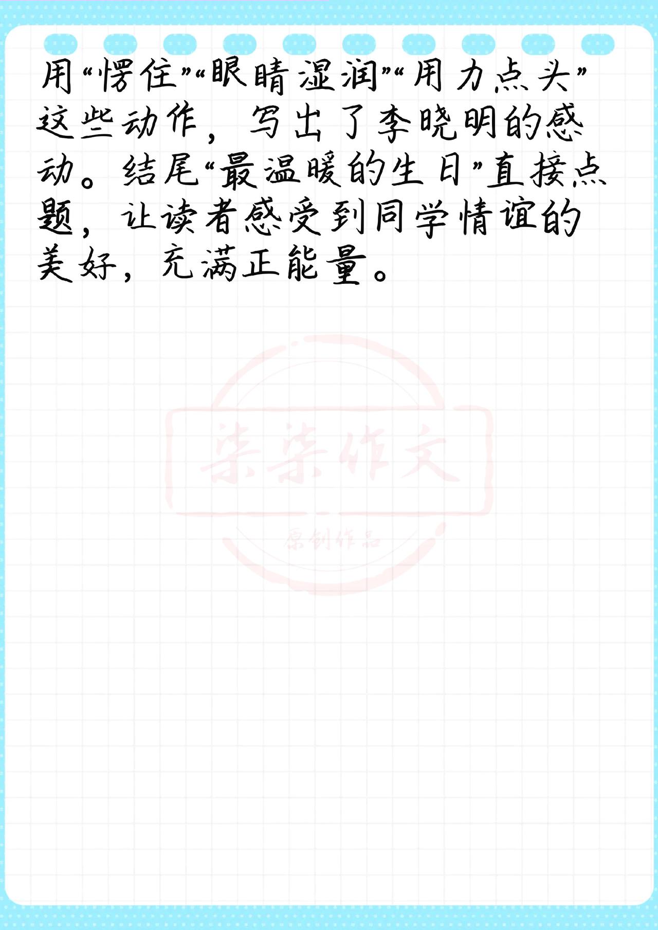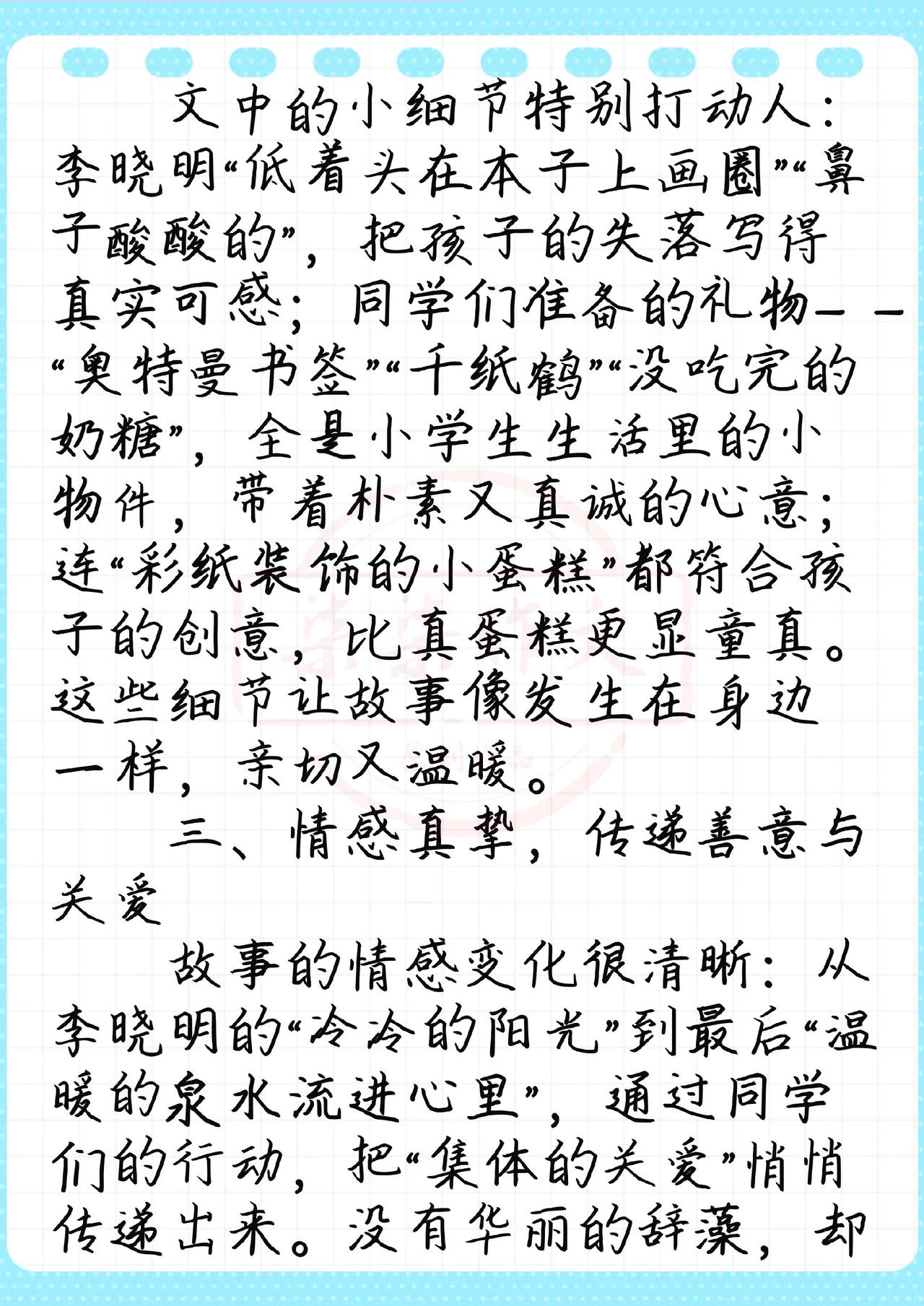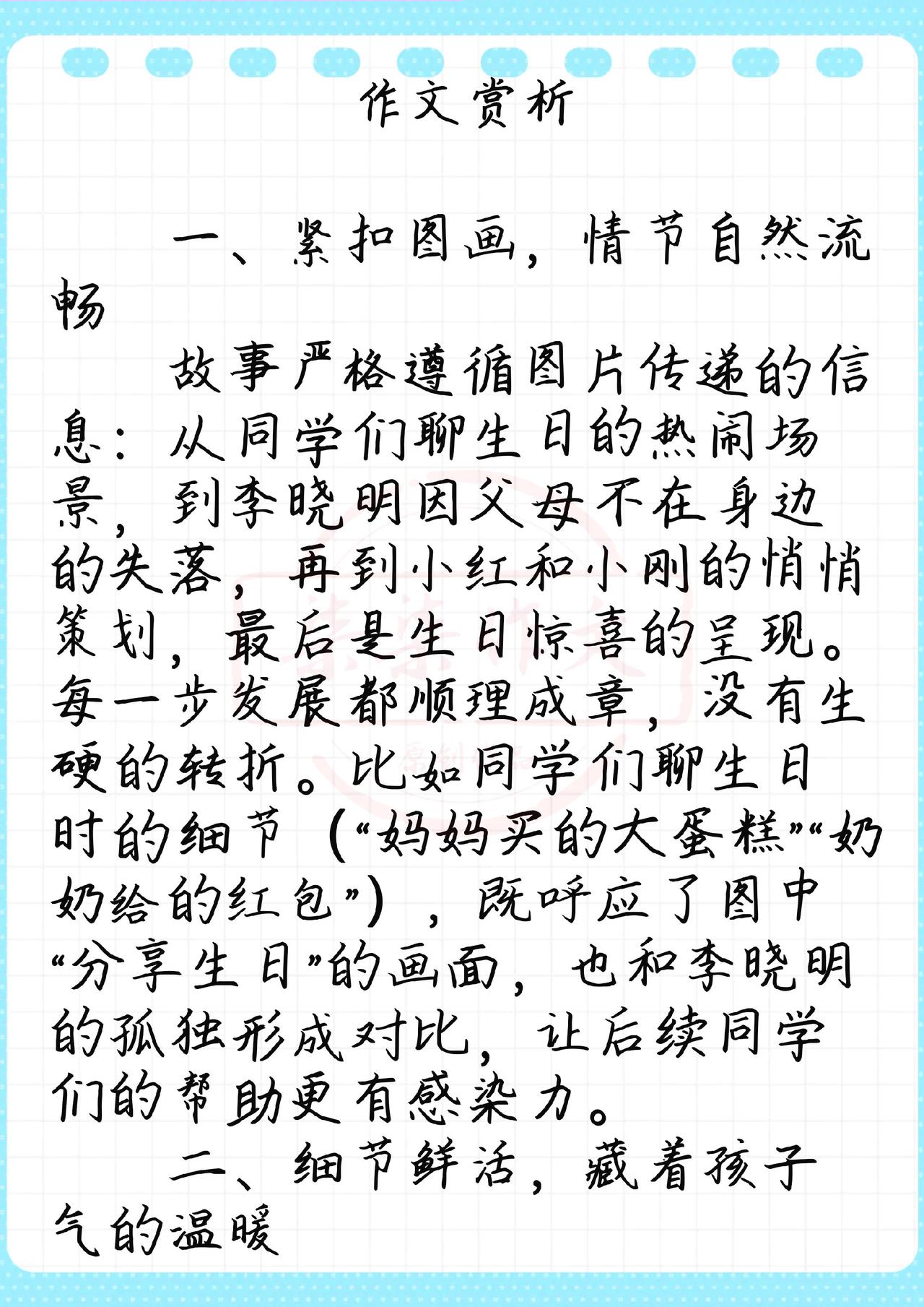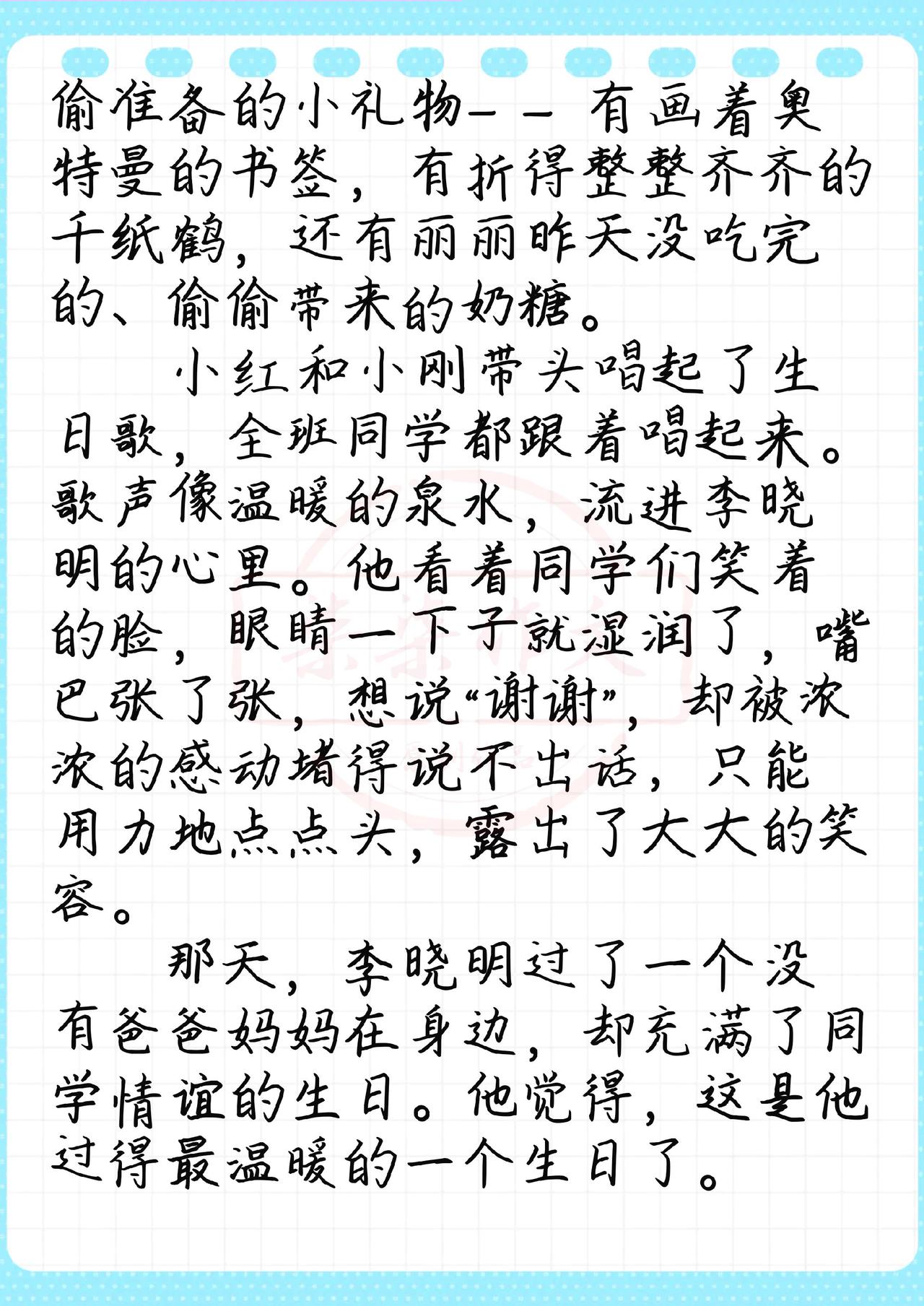 三年级上册第3单元作文优秀范文来啦!老师亲自批改过的高分作文,简单好模仿,照着写基础分稳拿~ 《李晓明过生日续写》作文构思: 要写好这篇故事续写,可以按照“梳理前情→预测发展→细化细节→传递情感”的步骤来: 第一步:梳理三幅图的前情,抓住核心矛盾 图一:同学们热烈讨论“自己的生日怎么过”,充满幸福; 图二:李晓明独自失落,因为“爸妈在外地,自己快生日了却没人陪”; 图三:小红和小刚发现了李晓明的失落,悄悄商量“给他过生日”。 核心矛盾是:李晓明渴望生日却缺家人陪伴,同学们想为他制造惊喜。 第二步:预测故事发展(续写的关键) 要围绕“同学们如何给李晓明过生日”展开,把“准备过程”和“生日当天的场景”写清楚,还要体现李晓明的“情感变化”(从失落→惊喜→开心→感动)。可以这样构思: 准备阶段:同学们偷偷分工(谁做贺卡、谁带小零食、谁画黑板等),要写出“悄悄准备”的小心思,比如怕被李晓明发现,课间凑在一起压低声音商量。 生日当天:重点写李晓明的反应(进教室时的惊讶)、同学们的行动(唱生日歌、送小礼物),把温馨的氛围写出来。 第三步:细化细节,让故事更生动 环境细节:生日当天的教室可以有变化,比如黑板画了气球、桌上摆着彩纸装饰的“小蛋糕”(用彩纸代替,符合小学生的创意)。 人物动作、神态: 李晓明:一开始“低着头画圈”(失落),看到教室变化时“愣住”“眼睛湿润”(惊喜、感动)。 同学们:商量时“拽胳膊、小声说”(偷偷摸摸的可爱),唱歌时“笑着、拍手”(真诚的快乐)。 对话与心理:加入同学们商量的对话(如小红提议、小刚响应),也可以写李晓明的内心想法(比如看到惊喜时,心里想“原来大家都记得我的生日”)。 第四步:传递温暖的情感 故事的核心是“同学之间的关爱”,所以结尾要落在李晓明的“感动”和“温暖”上,让读者感受到集体的善意。比如写他“露出大大的笑容”“觉得这是最温暖的生日”。 按照这个思路,把“准备的秘密”“生日的惊喜”“大家的互动”和“李晓明的心情”串起来,就能写出一篇温馨的故事啦。作文素材 小学作文 作文素材积累 优秀作文