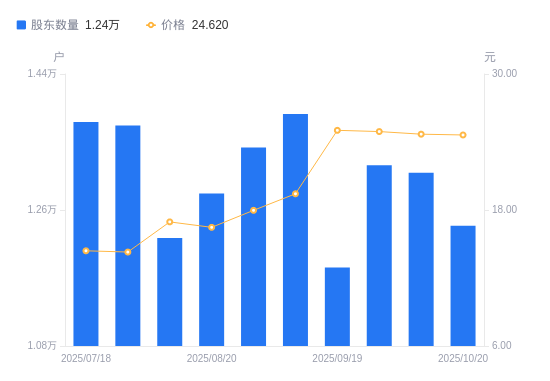 日期A股户数(户)流通A股户均持股数(股)户均持股市值(万元)2025-10-201239210222.1625.172025-10-10130949674.1323.892025-09-30131919602.9923.932025-09-191184010698.7326.782025-09-10138719132.2217.742025-08-29134269434.9016.952025-08-20128189882.4316.282025-08-081223010357.5617.562025-07-31137209232.7313.192025-07-18137659202.5413.25