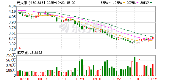 光大银行10月22日大宗交易平台出现一笔成交,成交量93.16万股,成交金额326.06万元,大宗交易成交价为3.50元。该笔交易的买方营业部为国泰海通证券股份有限公司成都双庆路证券营业部,卖方营业部为国泰海通证券股份有限公司总部。