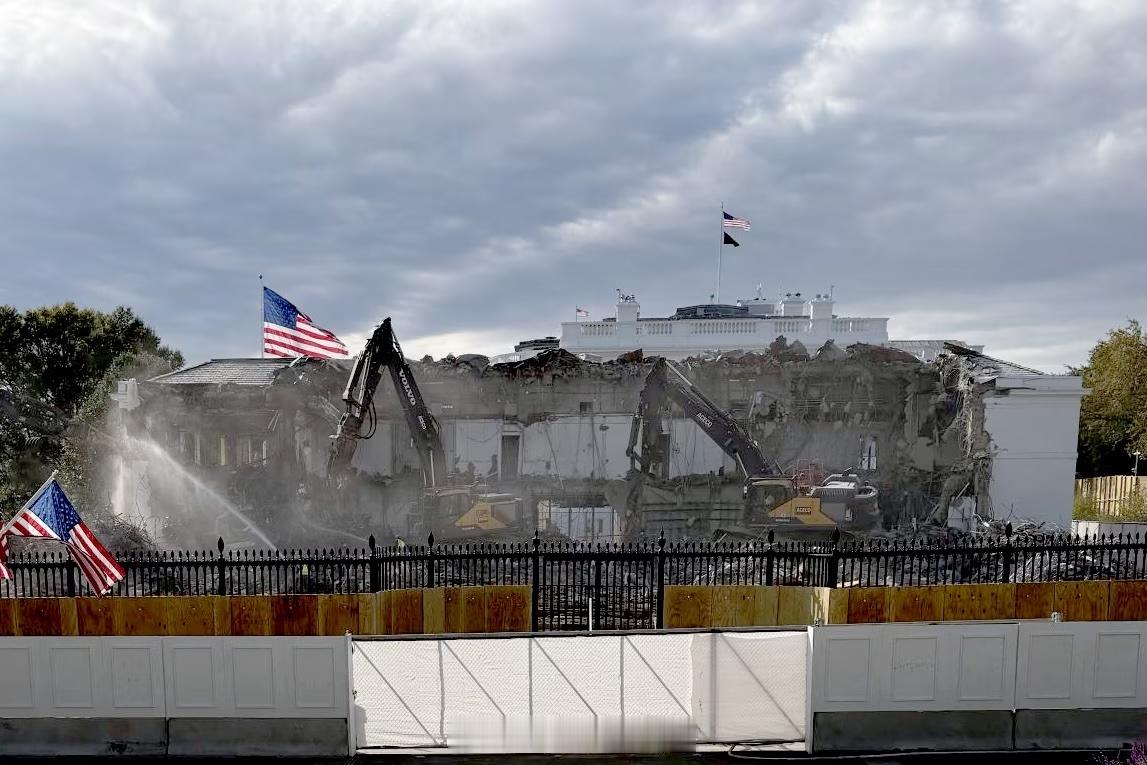 根据获得的照片以及两位匿名知情人士的说法,从周一东入口被拆除开始的白宫拆除工程,到了周二已经推进到东翼的大部分区域被毁。
