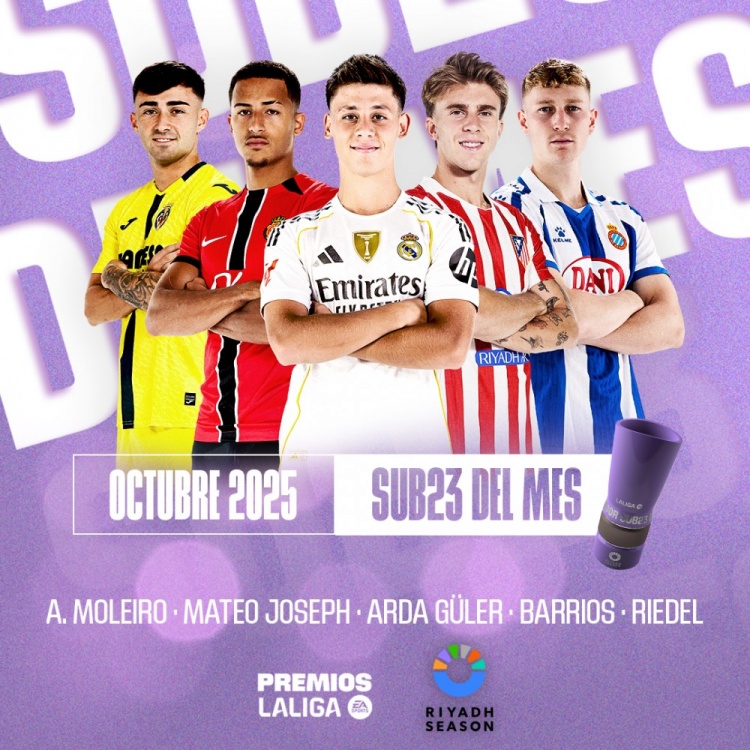 直播吧10月23日讯西甲官方公布了10月最佳U23球员候选名单,皇马小将居莱尔领衔。