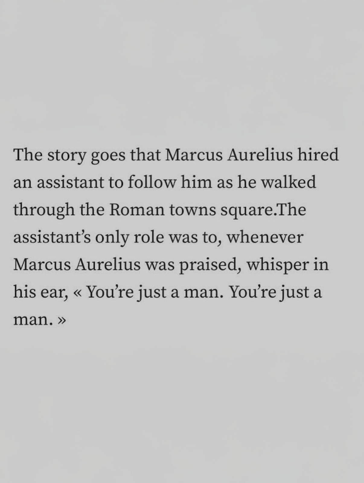 据说马可-奥勒留雇了一位助手,陪他一起走过罗马的广场。那位助手的唯一职责就是:每当人们赞美马可-奥勒留时,便在他耳边轻声提醒一句——「你只是一个凡人,你只是一个人。」