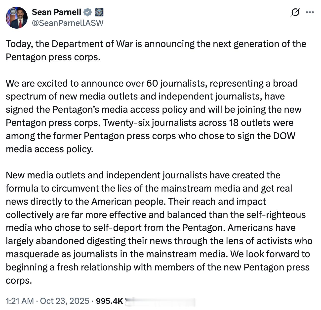 国防部公布新一批五角大楼新闻报道团队的组成,由于传统主流媒体拒绝在新版“承诺书”上签字: 新一批60人左右的媒体团几乎全是右翼媒体,包括: