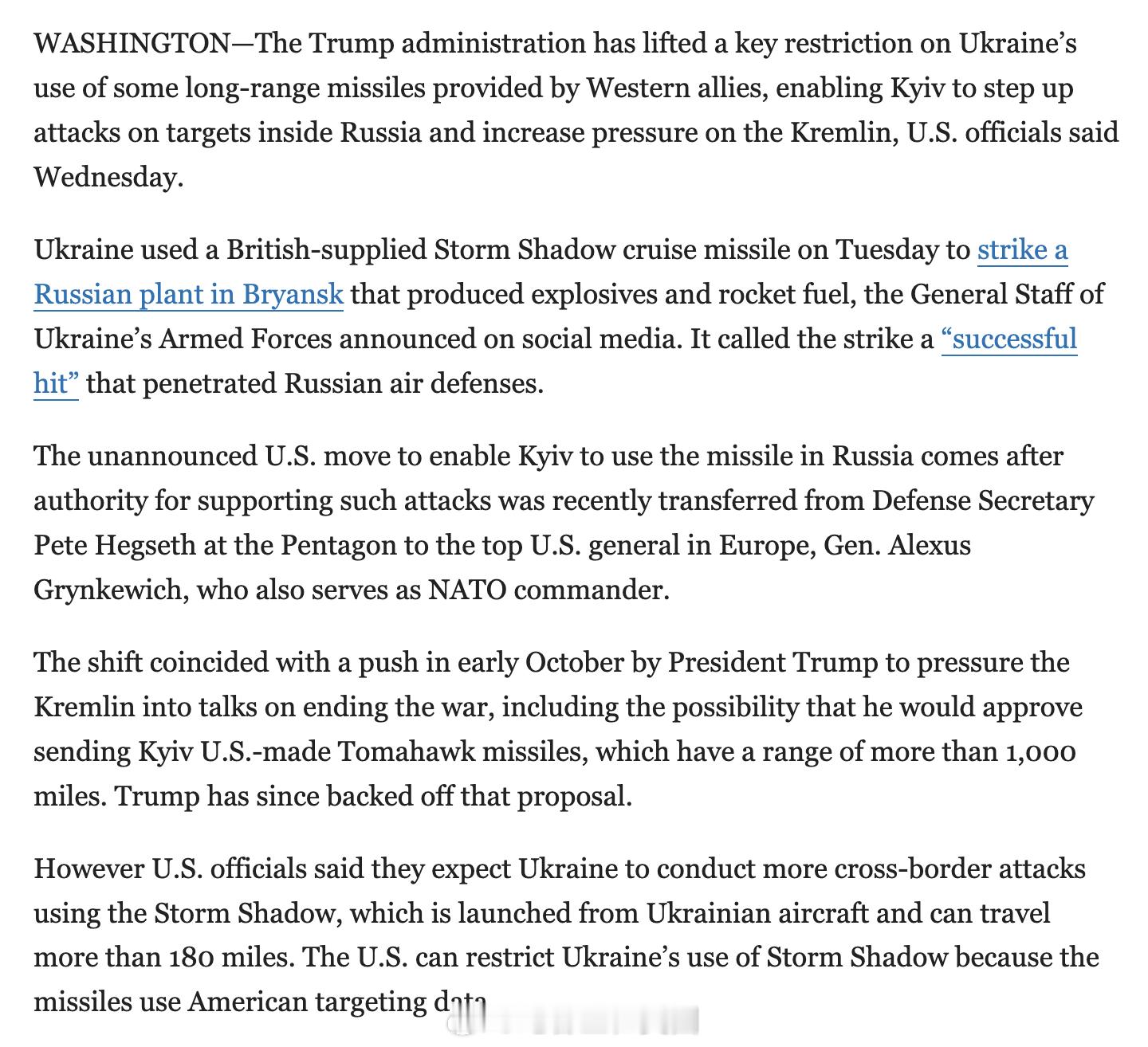 WSJ: 川普政府已解除对乌克兰使用部分由西方盟友提供的远程导弹的关键限制,使乌克兰能够加大对俄罗斯境内目标的攻击力度,以此对俄罗斯施压。