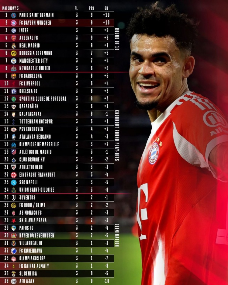 目前拜仁3战全胜,以10个净胜球排在欧冠联赛阶段的第2名,因进球数比巴黎少一个所以暂时排在第2名,下一场双方将迎来榜首之战。