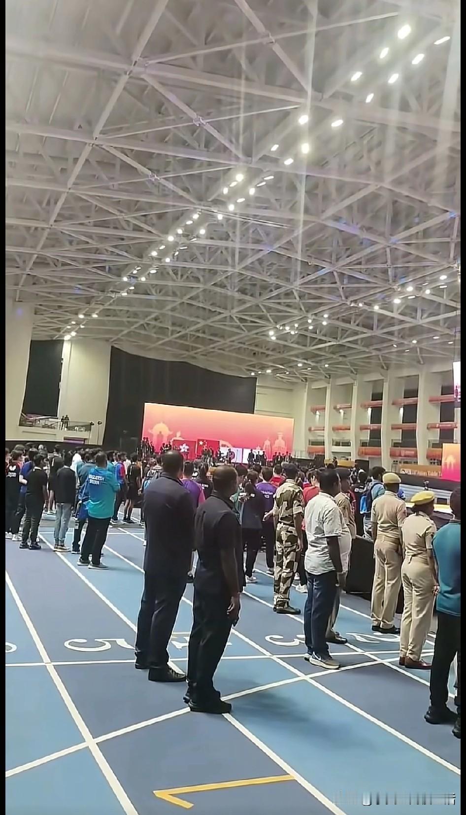终于知道亚锦赛为什么没有升国旗的画面了。因为印度比赛场馆根本就没有升国旗的旗杆。他们是在大屏幕里升的国旗。 比赛结束,决赛的四支球队所有运动员都在赛场中间的椅子上坐了一个多小时看音乐会。然后才颁奖,但是没有准备升旗的东西,而是看着大屏幕里的国旗听国歌。这也是头一次见。不知道这是印度没有这个能力还是印度的新发明,是真没时间还是故意。